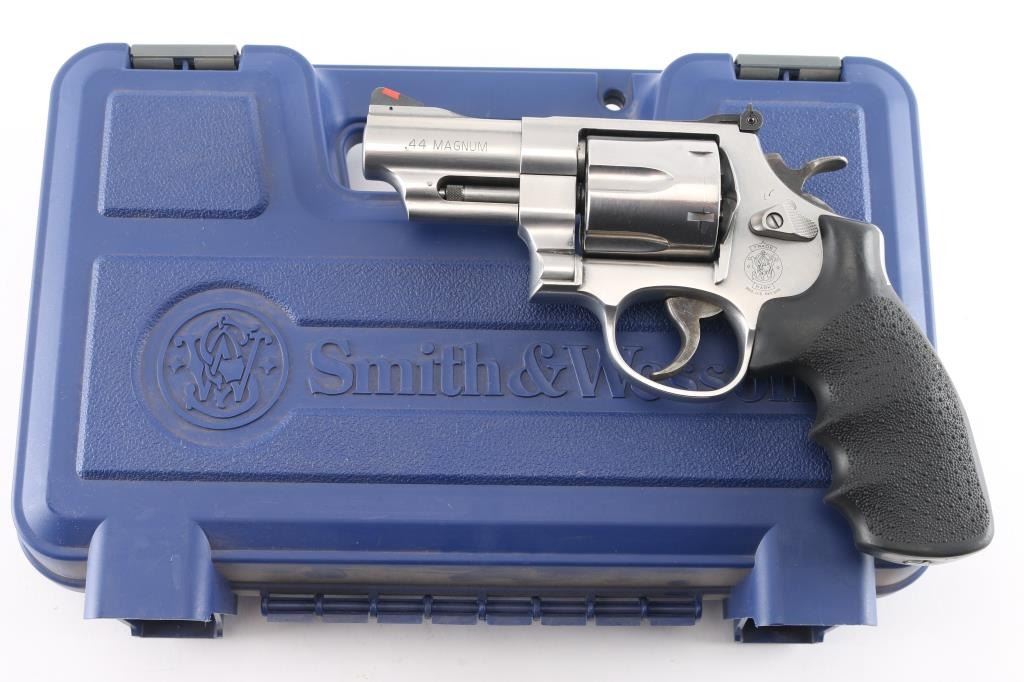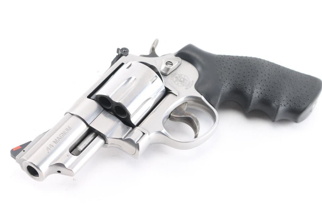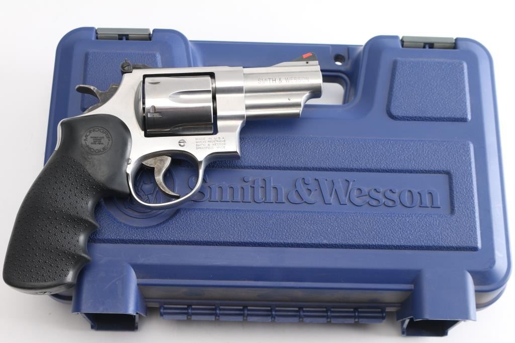 Large frame stainless steel double-action revolver chambered in .44 Magnum. Features a brushed finish, 3" barrel with a raised serrated ramp front sight with orange insert and micrometer adjustable white square notch rear sight, case colored smooth trigger, case colored checkered spur hammer, frame mounted firing pin, three screw round butt N target frame with smooth back strap, Hogue monogrip black rubber finger groove grip. Retains approx. 98% brushed metal finish with little to no scratches or marks. Action is smooth with tight lock-up. Bore is bright with strong rifling and grips are fine. Comes with original factory blue hard case, manual, lock, and two keys for the internal locking system, which has been removed. Condition is NRA Excellent. ***Modern Firearm.***