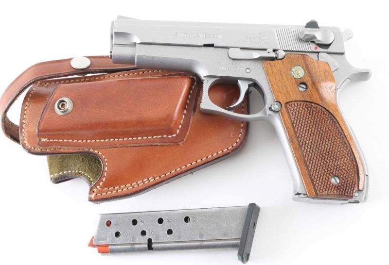 'Second Generation' American made double action semi-automatic pistol chambered in 9x19mm. Features stainless steel construction, 4" barrel, full-length guide rod, serrated ramp front sight, blued square notch rear sight in dovetail, smooth trigger, serrated round hammer spur, thumb safety/decocking lever on both sides of the slide, magazine disconnect safety, push button magazine release, factory 8 round magazine, knurled alloy backstrap and two-piece checkered walnut grips w/ silver S&W medallions. Bore is very good condition. Metal surfaces are very good with many small scratches. Rear sight shows bare metal on edges. Grips are very good condition, with small chip to right panel, medallions showing some green color. Includes good condition Safariland tan leather belt holster and spare magazine. Condition is near NRA Excellent *** Modern Firearm ***