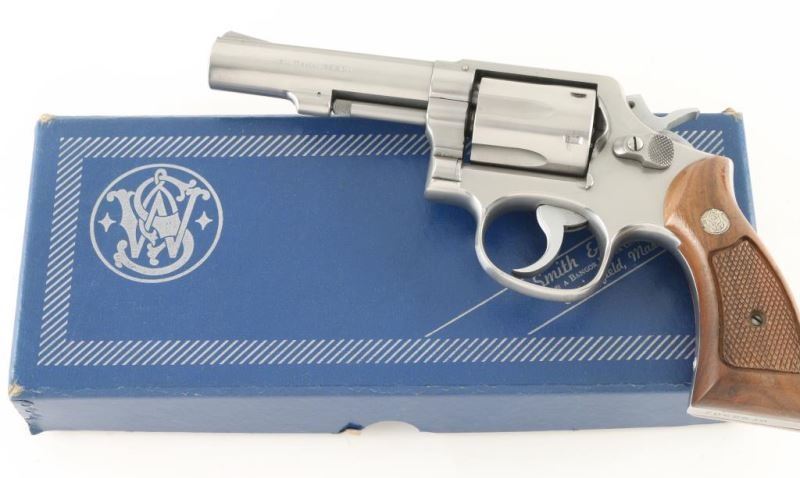 'Pinned & Recessed' double action revolver features stainless steel construction, checkered wood "Magna" grips with S&W medallions, 4" heavy barrel, serrated ramp front and fixed rear sights, square butt, "K" frame, 6 shot fluted cylinder. Overall condition is very good with smooth operation, tight lock-up, scuffs and rub marks showing as bright areas against brushed finish, very good bore. Grips are very good condition. Includes blue cardboard S&W box with factory paperwork. Condition is NRA Very Good++ *** Modern Firearm ***
