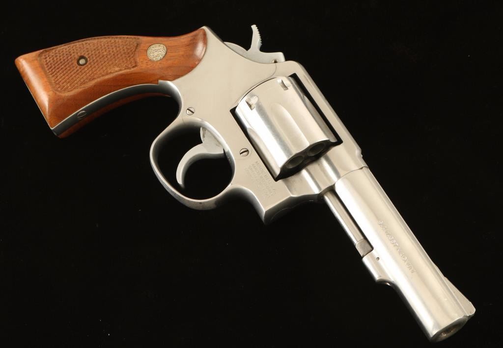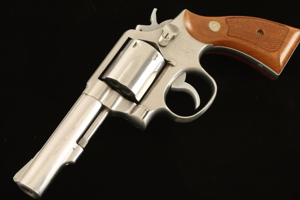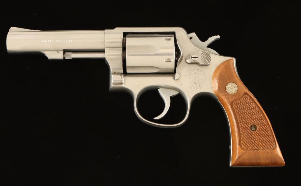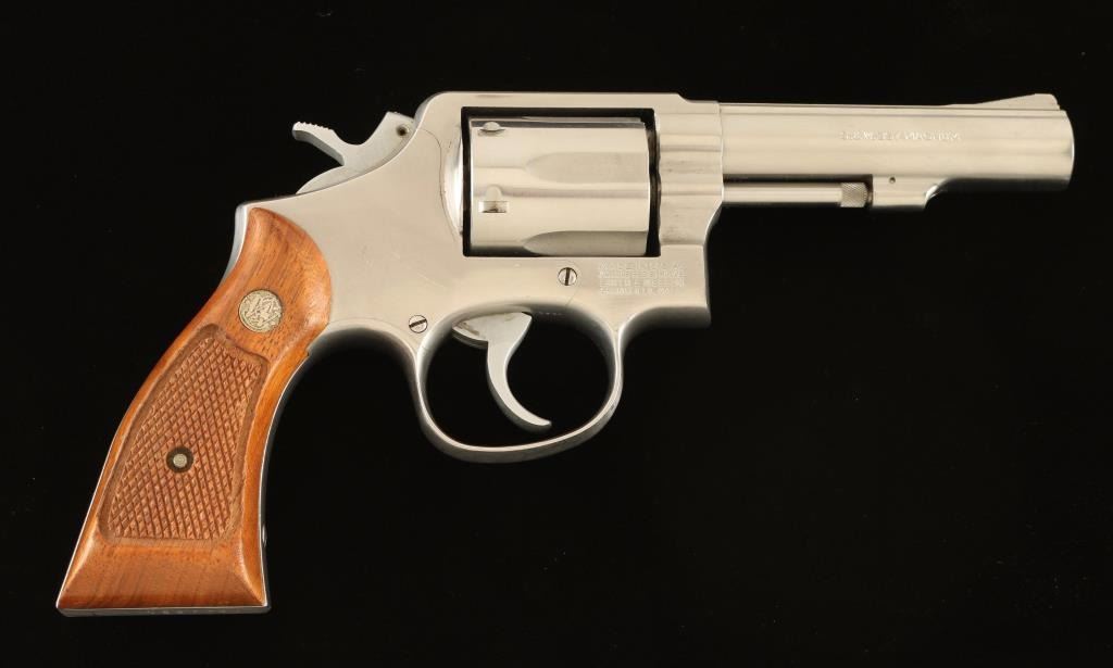 'M&P Heavy Barrel’ Medium frame stainless steel double-action revolver chambered in .357 Magnum, circa 1982-1988. Features a brushed finish, 4” heavy barrel, non-shrouded ejector rod, ramp front sight, square notched rear sight, square-butt frame, fluted six-shot cylinder, .312” combat trigger, .265” service hammer, and checkered two-piece Magna grips with S&W medallions. Revolver exhibits a drag line on the cylinder, moderate handling marks/fine scratches and a few bright scratches. Action is smooth with very good lock-up, bore is excellent and wood grips are good++ with some worn points & minor losses. Condition is very good. ***Modern Firearm***