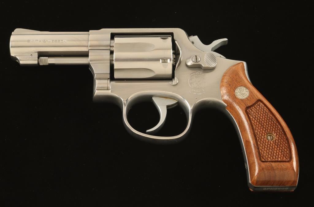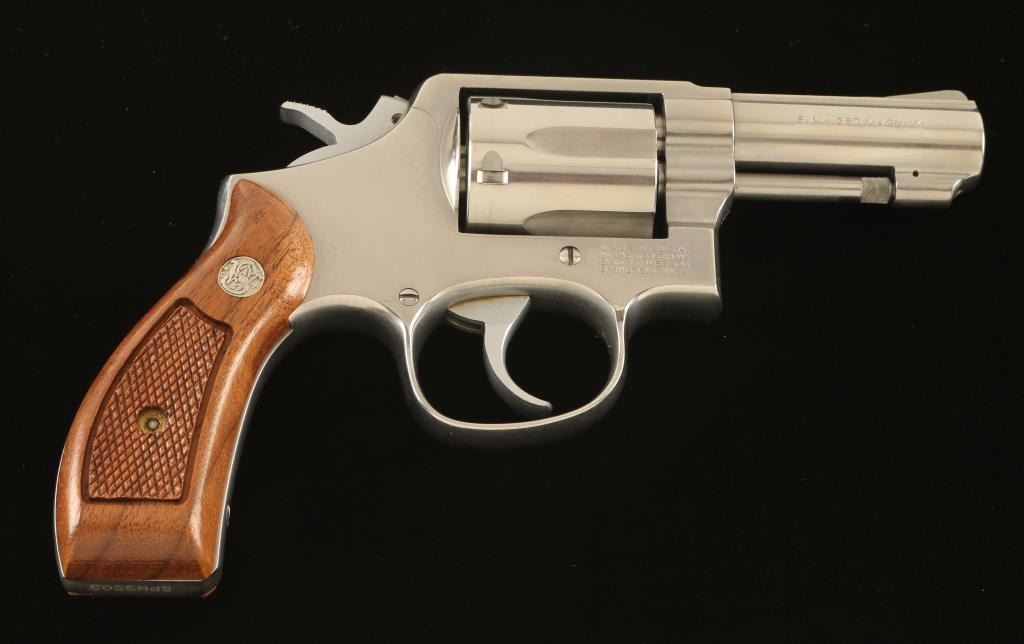 ‘M&P Heavy Barrel’ Medium frame stainless steel double-action revolver chambered in .357 Magnum, circa 1988-1996. Features a brushed finish, 3” heavy barrel, non-shrouded ejector rod, ramp front sight, square notched rear sight, fluted six-shot cylinder, .312” smooth combat trigger, .265” service hammer, round butt K frame and two-piece checkered walnut Magna grips. Includes the original factory cardboard box with documents. Revolver exhibits a drag line on the cylinder, some scattered bright blemishes/rubs and modest handling wear. Action is smooth with very good lock-up, bore is pristine and wood grips are near fine with some minor imperfections. Condition is very good in box. ***Modern Firearm***