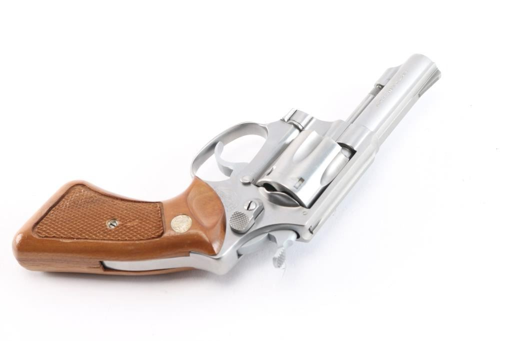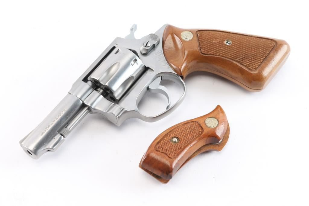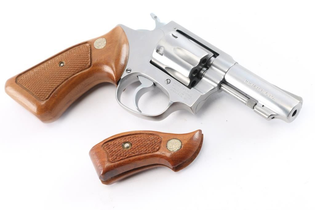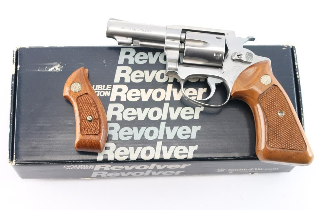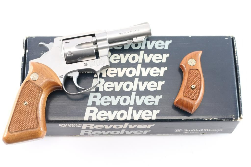Smith & Wesson stainless double action six shot revolver chambered in .22 Winchester Magnum Rimfire, manufactured in Springfield MA. MRF service kit gun made circa 1983-1988. It is a round butt 'J' frame with a six shot fluted cylinder, and three inch barrel. It features a smooth curved trigger, serrated ramped front sight, notched rear sight, checkered hammer, passive firing pin, exposed ejector rod, and two piece wrap around wood grips with S&W medallions. The stainless finish is approximately 99% with very little handling marks, grips are excellent, and bore and cylinder are excellent. This comes with the original factory box, original checkered walnut Magna grips, cleaning kit, spare hammer, and the owners manual.