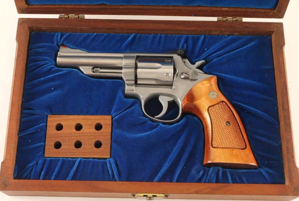 'Combat Magnum' Medium frame stainless steel double-action revolver chambered in .357 Magnum, circa 1970-1977. Features a brushed finish, pinned 4" barrel with serrated top rib, shrouded ejector rod, raised ramp front sight with orange insert, micrometer click adjustable rear window sight with white outline, fluted six-shot cylinder with recessed chambers, .265" service trigger, .375" semi target hammer, square butt K target frame with ten groove serrated grip straps and two-piece checkered walnut target grips with silver S&W medallions. Includes a wood presentation case with a blue velvet lined fitted interior, cartridge block and instructions. Revolver exhibits moderate handling wear and a light drag line on the cylinder. Action is smooth with solid lock-up, bore is pristine, and wood grips are fine. Condition is very good++ in case. ***Modern Firearm***