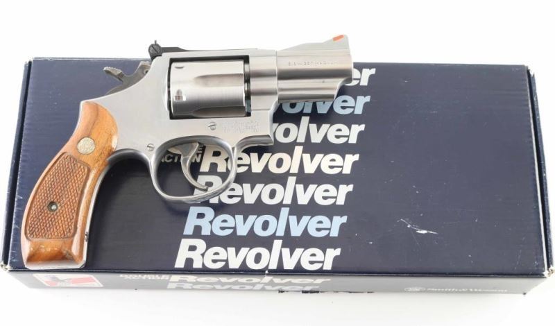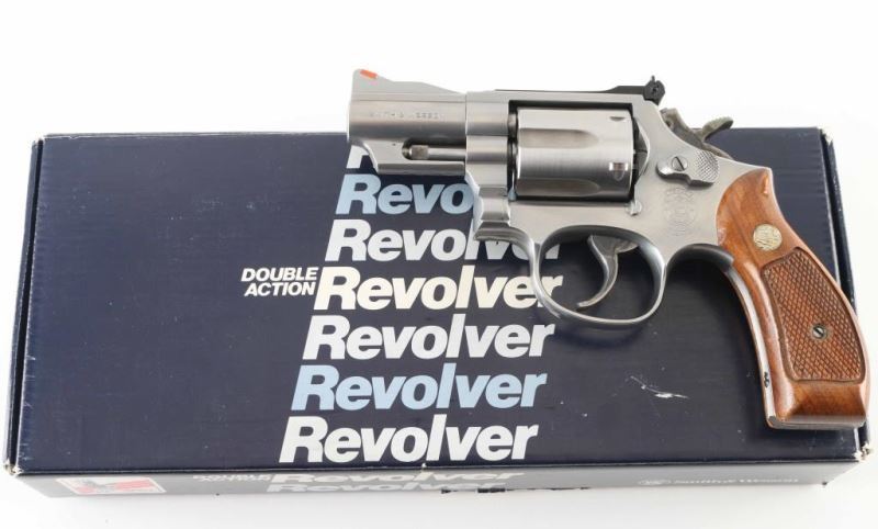 'Combat Magnum' Medium frame stainless steel double-action revolver chambered in .357 Magnum, circa 1995-1998. Features a brushed finish, 2 1/2" barrel with solid top rib, shrouded ejector rod, raised ramp front sight with orange insert, micrometer click adjustable rear window sight with white outline, fluted six-shot cylinder, .312" smooth combat trigger, .375" semi target hammer, round butt K target frame with ten groove serrated grip straps and checkered wood grips (wood not original to this gun but comes with original two-piece Uncle Mike's checkered black rubber wrap-around finger groove grips.) Includes the original factory box. Revolver exhibits mild handling wear and a barely visible drag line on the cylinder with no major wear observed. Action is smooth with solid lock-up, bore is outstanding. Small nick on bottom of wood grip. NRA Near Excellent