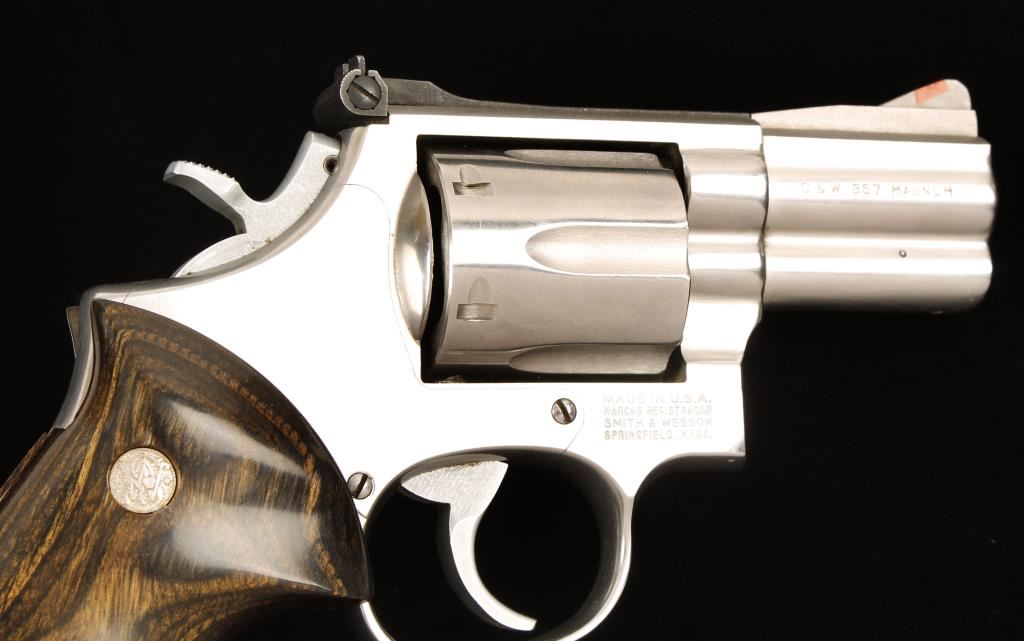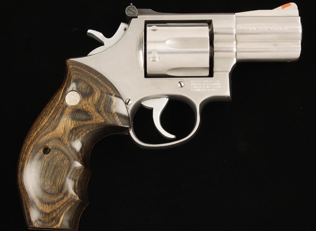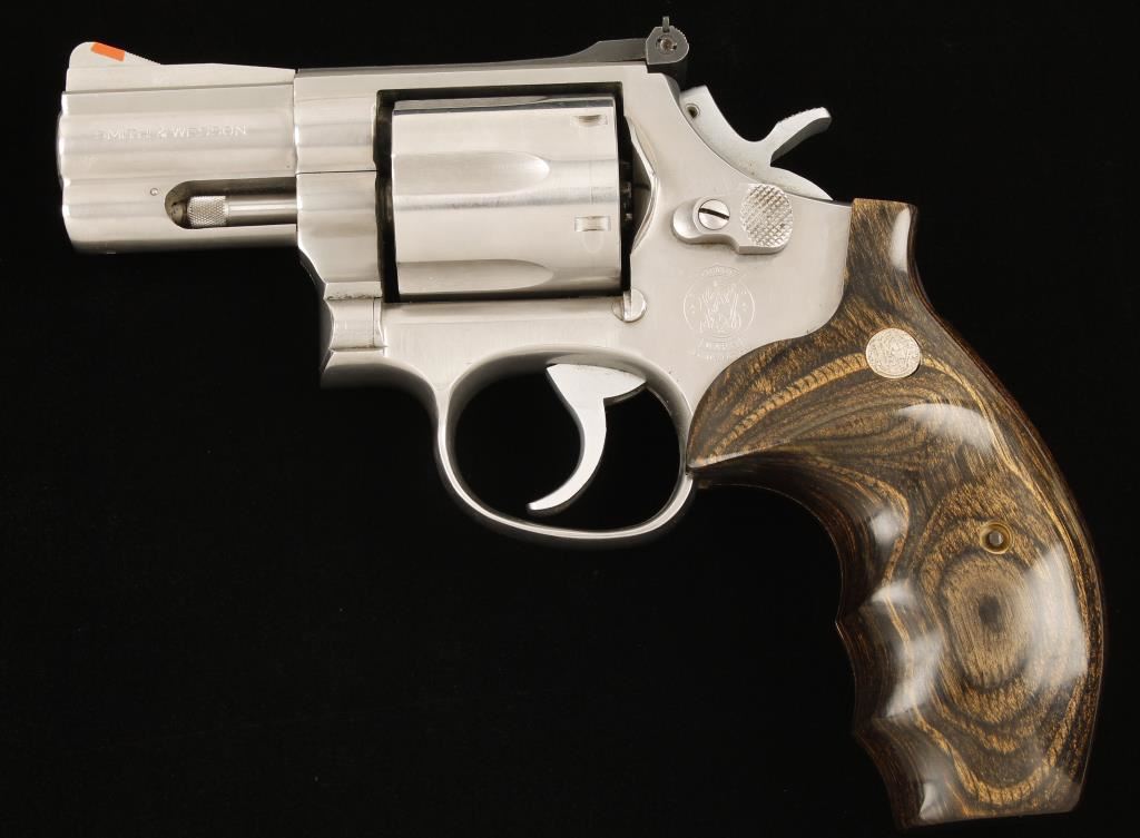 Stainless steel six shot double action revolver chambers in .357 Mag/.38 Special. Features a 2.5" full lug barrel, front ramped sight with orange insert, rear micrometer click adjustable sight, fluted cylinder, serrated backstrap, checkered hammer spur, smooth trigger and Smith & Wesson medallion laminated wood grips. Finish shows many small superficial scratches. Grips protrude over the frame near the top of the backstrap. Bore is good and action is very nice. Condition is very good. ***Modern Firearm***