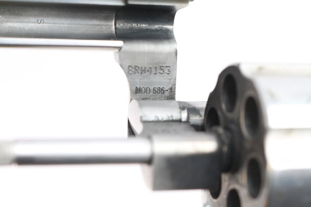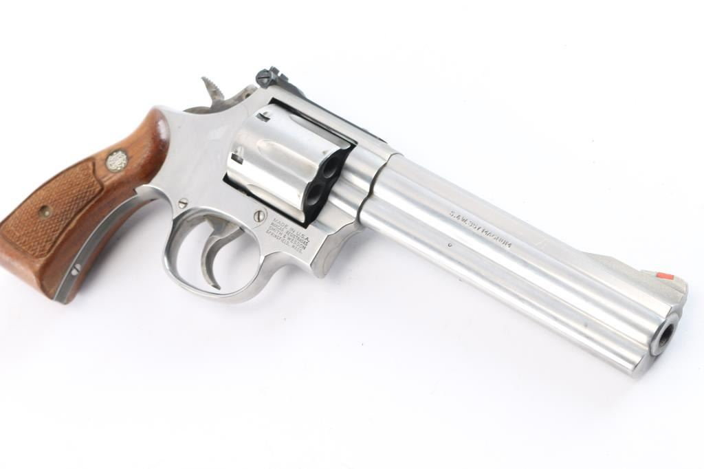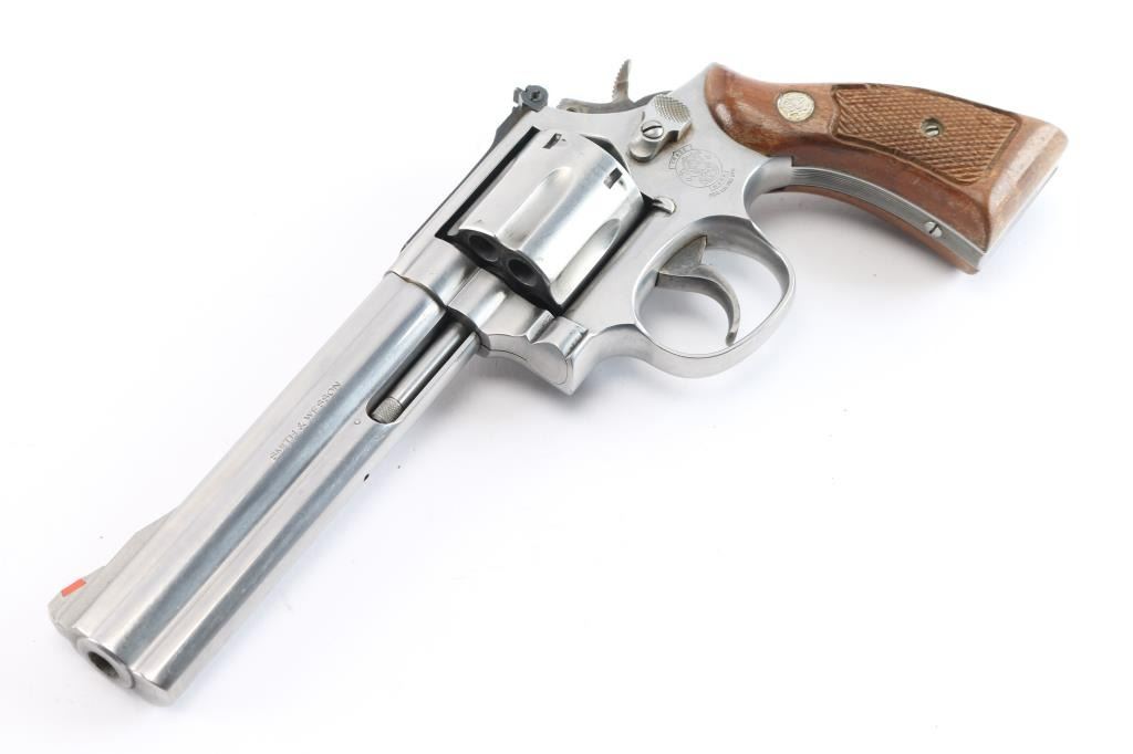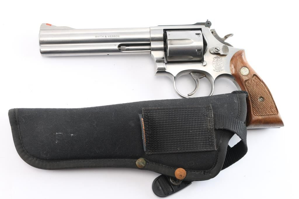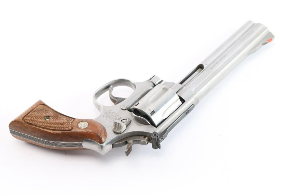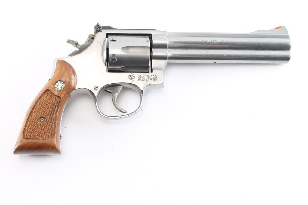 American made six shot revolver chambered for .357 Magnum ammunition. Built on the L target square butt frame. It features stainless steel construction with a 6" barrel, fluted cylinder, full underlug, smooth trigger, serrated blade front sight with orange insert, adjustable rear white outline sight on serrated sighting rib, knurled hammer spur and cylinder release, smooth trigger, serrated grip straps. Checkered walnut grips with S&W medallions. Metal finish is very with a faint drag line on the cylinder, minor scratches. Bore is excellent/bright. Action is smooth with tight lock-up. Grips show handling wear with a chip out of the left checkered panel's edge. Could use a good cleaning. Comes with a Uncle Mike's black nylon holster.
