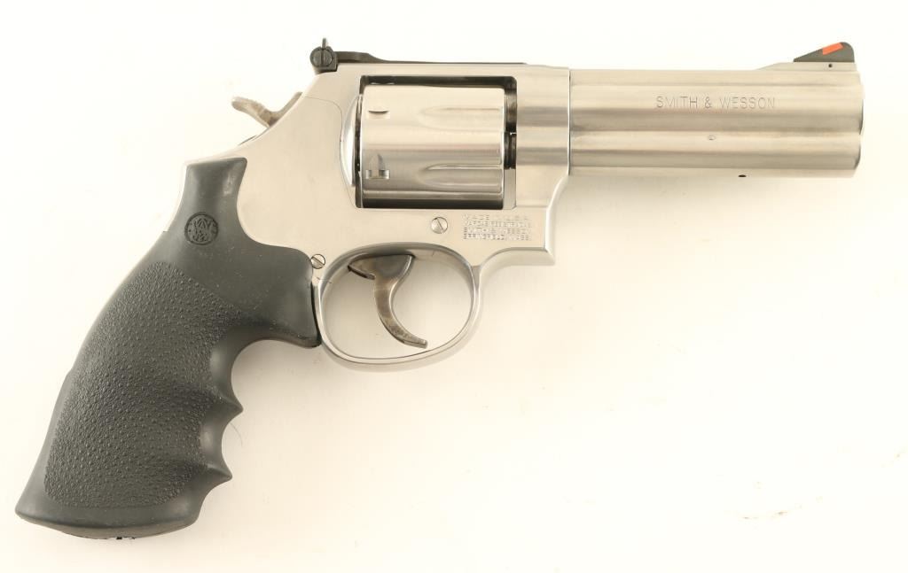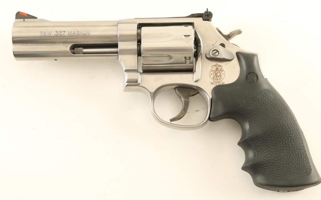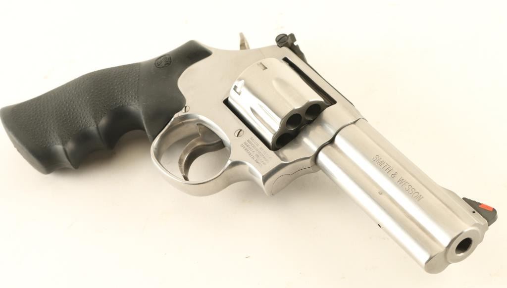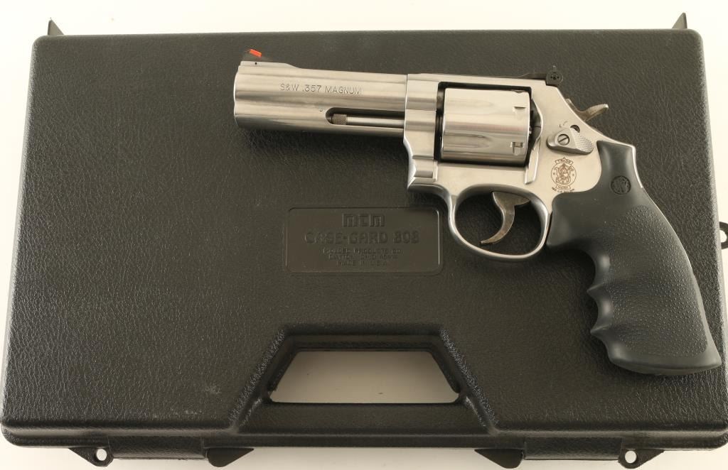 "7 shot" double/single action revolver built on the "L" frame, features stainless steel construction, contoured rubber Hogue style target style grips with molded-in S&W medallions, 4" barrel with full length underlug, adjustable sights with orange ramp and white outline rear, key lock safety in frame. Bore is excellent. Overall condition is excellent with few signs of handling and use. Action is smooth with tight lock-up. Includes MTM Case Guard case, manual, fired case. Condition is NRA Excellent *** Modern Firearm ***