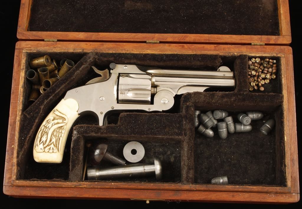 Cased, nickel plated Smith & Wesson top-break, spur trigger .38 Single Action Model No. 2 1st Model. Features a 3.25" ribbed barrel, pinned round blade front sight, v-notch rear sight, five shot fluted cylinder, case hardened hammer, blued checkered spur trigger and relief carved ivory grips depicting an eagle and snake on the right grip. Includes compartmentalized felt lined wood case with brass furniture, bullets, brass shells, loading tools and primers. 80%+ original nickel finish remaining, only minor losses in select areas. Hammer shows beautiful case hardened colors. Crisp barrel address. Bore is bright, extractor works well as does the action. Condition is excellent as antique. ***Antique Firearm***