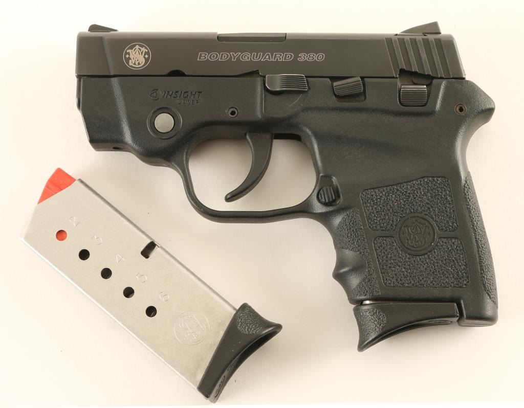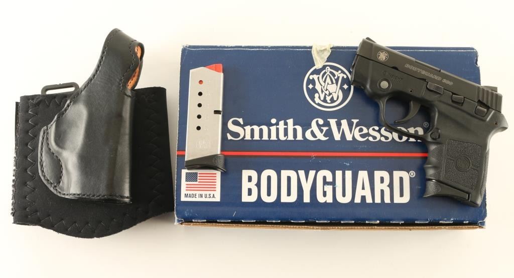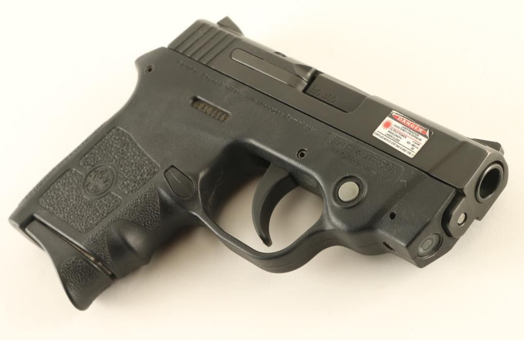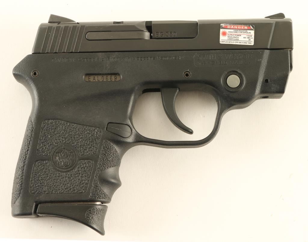 Semiautomatic pistol features black color finish on metal parts, textured black polymer frame with integral red laser sight, 2.75" barrel, fixed sights in dovetails, loaded chamber view port, DAO (double action only) trigger with restrike, frame mounted manual safety. Bore is excellent. Overall condition is excellent with few signs of handling. Includes (2) magazines, very good condition black leather ankle holster by DeSantis, factory box with zipper case & manual. Condition is NRA Excellent - like new *** Modern Firearm ***