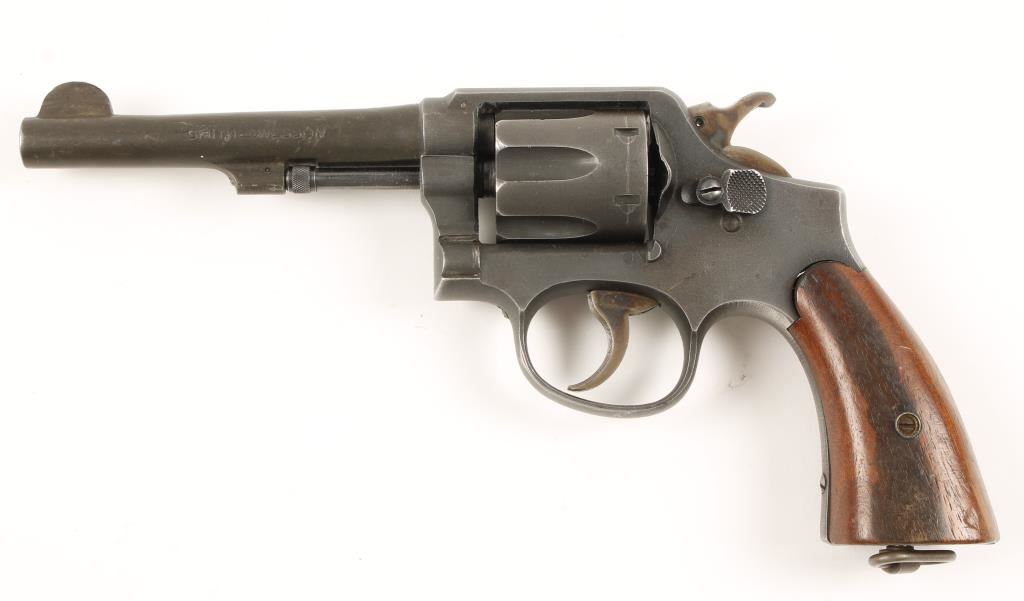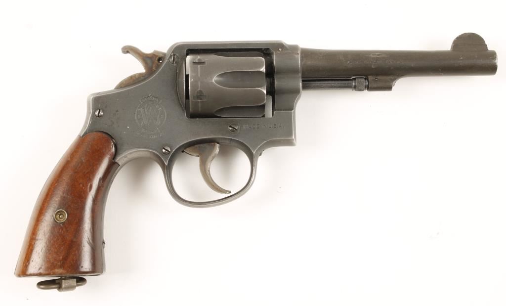 "Black Magic" finished double-action 6-shot revolver with a 5" barrel. Has a flaming bomb ordnance proof on the butt. Color case hardened trigger and hammer. Finish is worn at high points and on the front and back straps. A drag line is present. There are no British proofs on this pistol. Pinned barrel with integral front sight. Bright bore and chambers. Plain unmarked wooden grips. Some of the screw heads are slightly buggered. The action is good with some end shake and a looseness in the lock-up. Condition is good. *Modern Firearm*