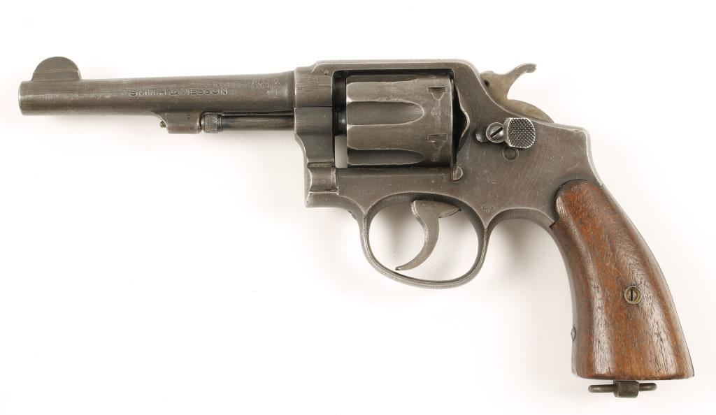 Blued steel double-action 6-shot revolver with a 5" pinned barrel with integral front sight. There are a multitude of British proofs on the frame, barrel and cylinder as well as being marked "United States Property" on the topstrap. Bore and chambers are bright and shiny but need a good cleaning. Action is smooth and tight. Rough machining has left the finish worn to a uniform grey with corner and high point wear. The wooden grips are smooth and unmarked but complete and in good condition. The action is smooth and tight. Condition is good. *Modern Firearm*