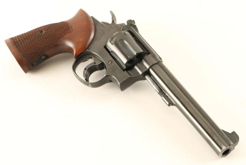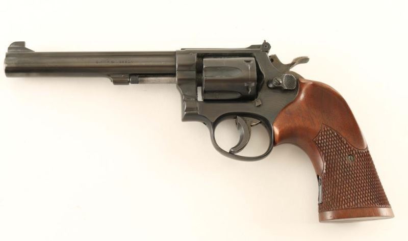 SN: K209421 'Pre-Model 14' Vintage medium frame double-action revolver chambered in .38 Special, circa 1949-1955. Features a blued finish, pinned 6" barrel with a wide rib, 1/8" patridge front sight, adjustable micrometer click rear sight, fluted six-shot cylinder, non-shrouded ejector rod, .265" trigger with a wide trigger shoe installed, .500" target hammer, square butt K target frame with six groove grip straps, and custom two-piece checkered 1x walnut target grips with thumb rest on the left panel. Serial numbers match on the frame, barrel, cylinder and extractor. Revolver appears to retain approximately 96% of it's original finish but has heavy amounts of powder residue coving various surfaces. Action is smooth with very good lock-up, bore is excellent, and the wood grips are fine. Condition: will likely clean to near NRA excellent. ***C&R Firearm***