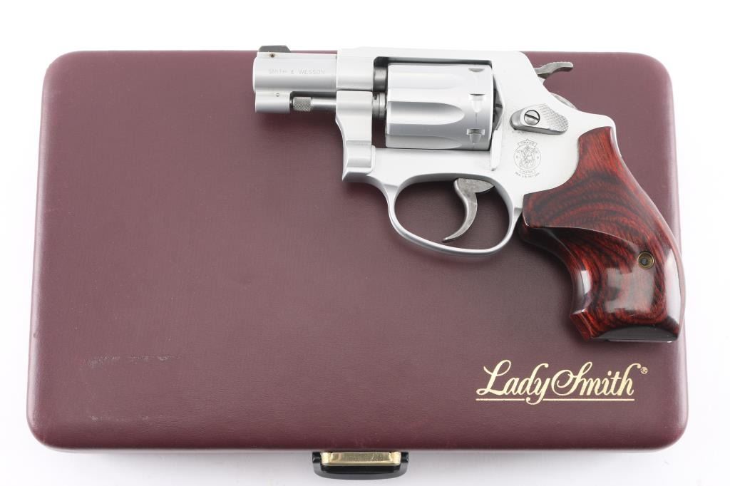 SN: CBY9130. 'AirLite' Double/single action revolver features lightweight frame, silver finish, checkered wood Magna grips with S&W medallions, lanyard loop in bottom of backstrap, 1-7/8" barrel with un-shrouded ejector rod, 8 shot fluted cylinder, fixed sights. Overall condition is nearly new with limited signs of handling. Action is smooth, lock-up is tight. Bore is excellent/bright. With factory fitted jewelry-style case, paperwork with key. White cardboard sleeve with matching end label.