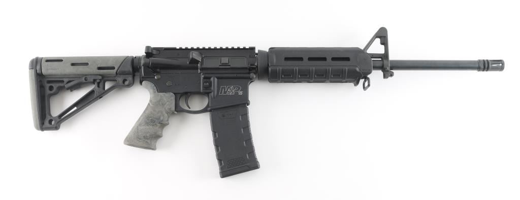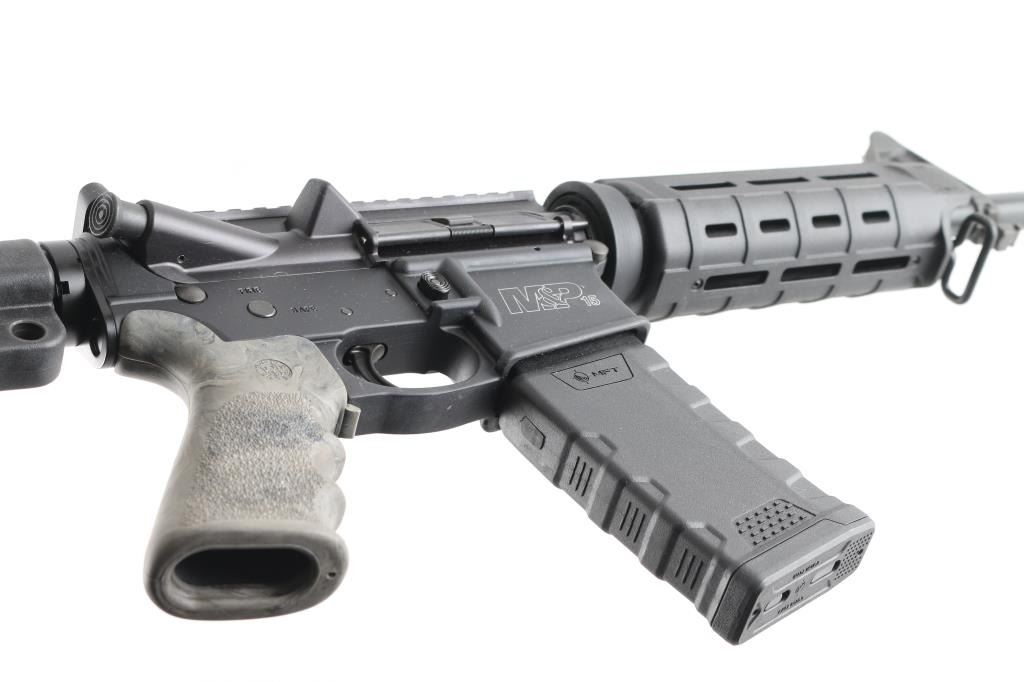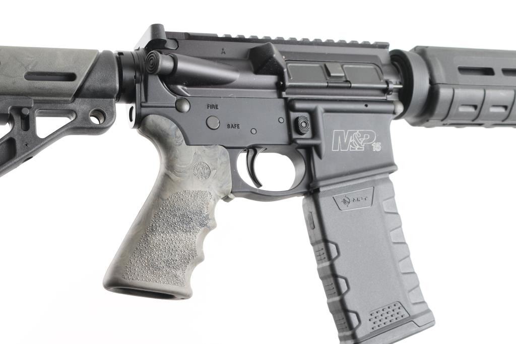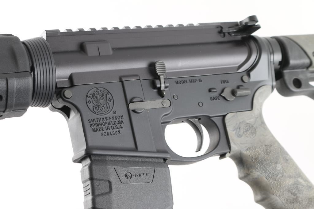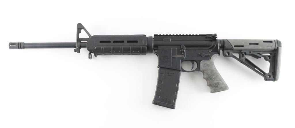 Semiautomatic AR15 type rifle features matte black finish on metal parts, black polymer Magpul forend, green camo Hogue pistol grip, 16" 1:9" twist barrel, flash hider, bayonet lug, protected post front sight, no rear sight, Picatinny rail top on receiver, front sling swivel, sling slots in stock, manual safety, ejection port cover, forward assist, black polymer Hogue collapsing 5 position carbine butt stock with green camp cheek rest panel. Bore is very good. Retains 95% finish with handling marks. Includes black polymer 30 rd magazine by MFT (Mission First Tactical). Condition is NRA Excellent *** Modern Firearm ***
