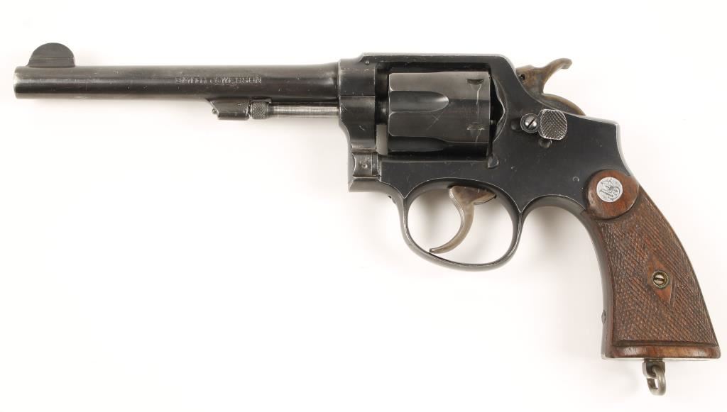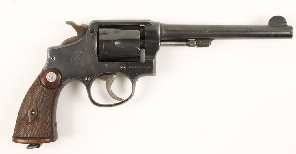 Blued double-action 6-shot revolver with a 6" barrel. Finish has light edge wear, moderate drag line and scratches. Case colored hammer and trigger still have colors. Bore is shiny and chambers are clear. Functions well with good lock-up. Checkered wood grips have medallions, are missing one tiny chip and have some rubs. Condition is good. *Modern Firearm*
