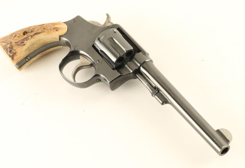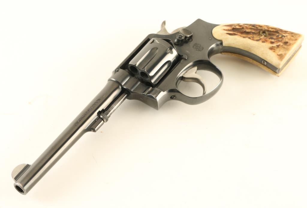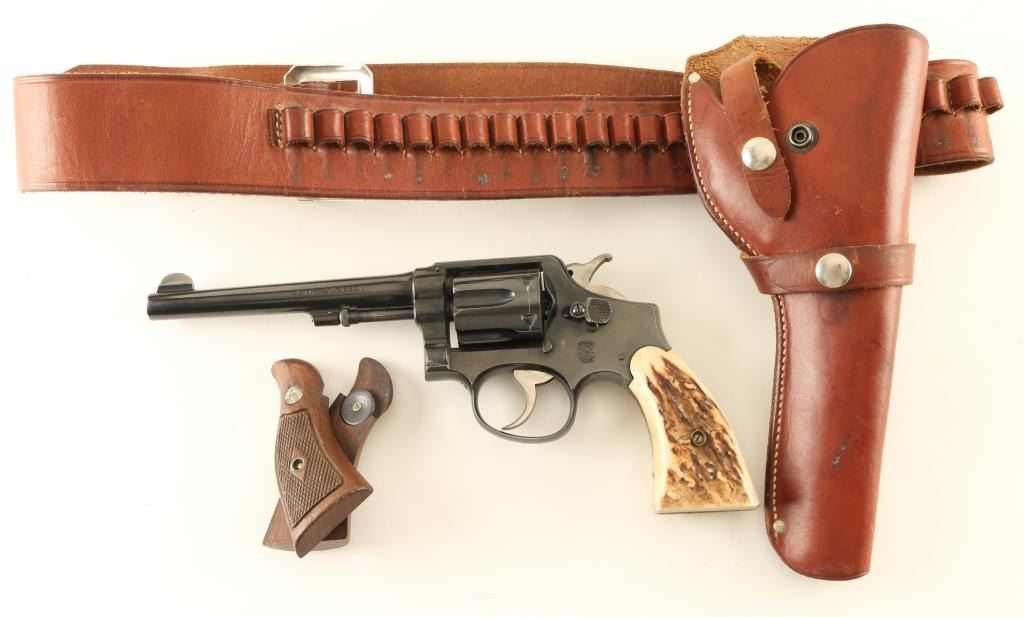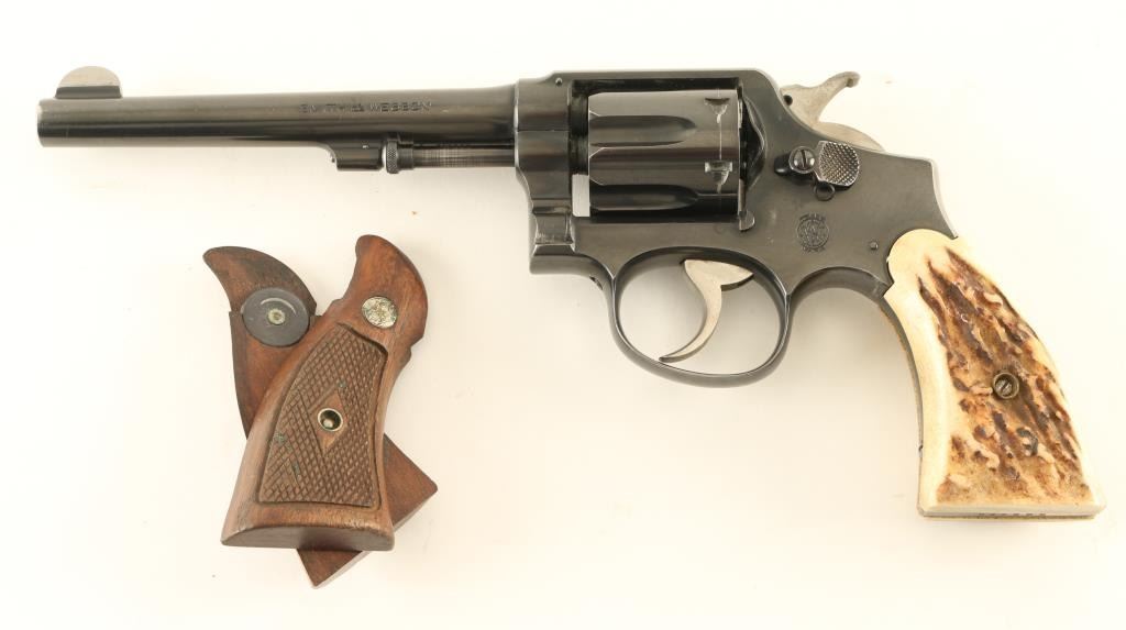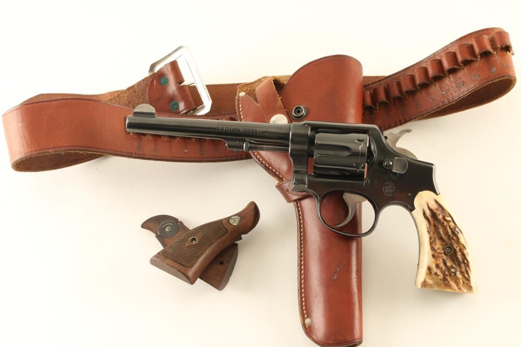 SN: 393529 Double/single action revolver features blued finish, imitation stag grips, 6" barrel, fixed sights. Bore and cylinder charge holes are very good. Retains 75% blue with bare metal at muzzle, sides and rear of front sight (appears purposefully removed), cylinder drag line, sharp edges, around side plate screw holes, ejector rod. Backstrap and bottom of frame are brownish color patina over bare metal. Grips are very good condition. Action is smooth with tight lock-up. Includes good condition S&W factory Targa style grips, very good condition russet color leather holster rig with belt. Belt is 45" long with 25 loops for 38 cal cartridges. Condition is NRA Good++ *** C&R Firearm ***