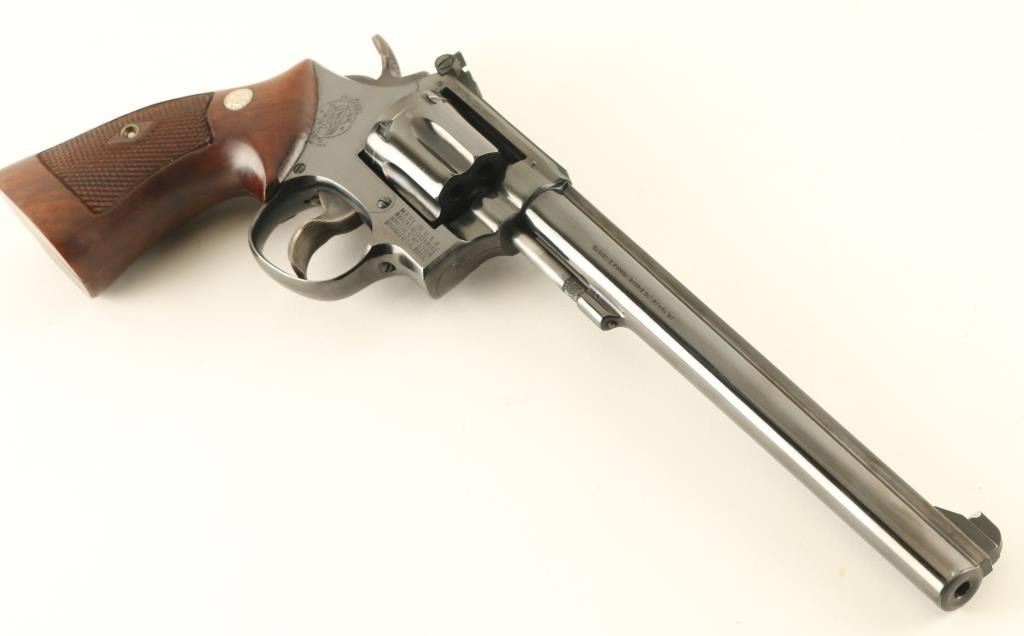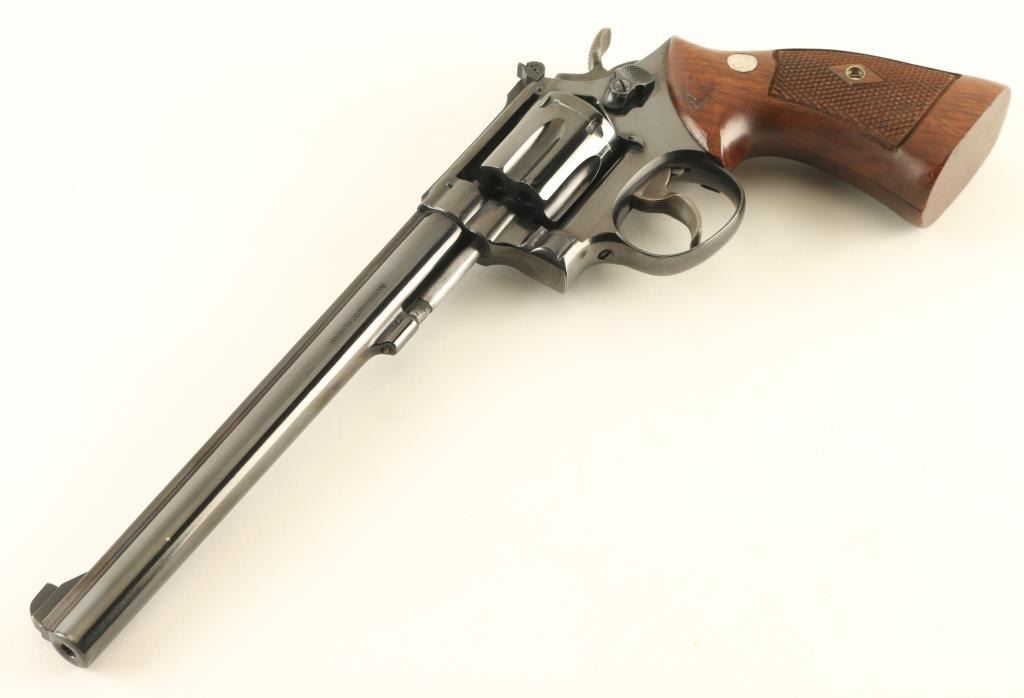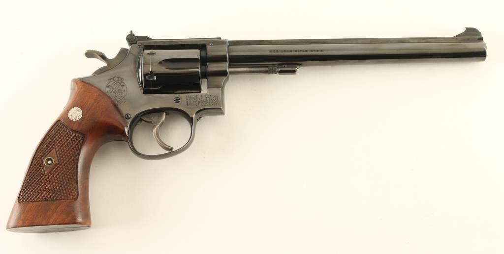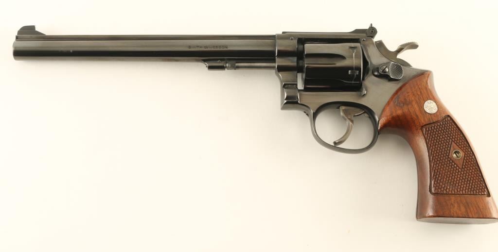'No Dash' double/single action revolver manufactured circa 1957 - 1959. Features blued finish, checkered wood target type grips with nickel S&W medallions, 8-3/8" barrel, adjustable sights, grooved wide trigger, checkered wide spur hammer. Bore is excellent. Retains 95% blue, with visible drag line on cylinder, bare metal at edges of muzzle & on ejector rod, other signs of use. Rear face of front sight painted white. Hammer and Trigger retain excellent case color. Grips are excellent. Action is smooth, locks up tight. Condition is NRA Very Good ++ *** C&R Firearm ***