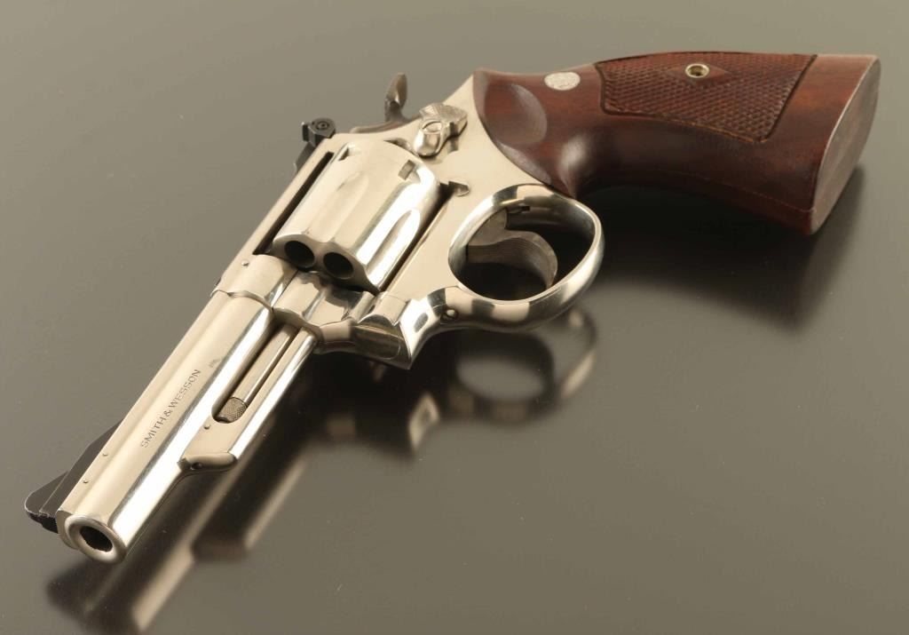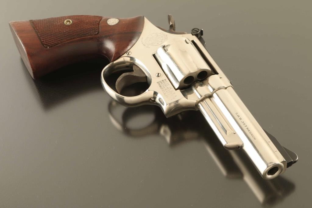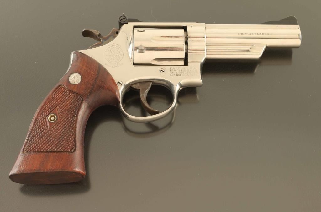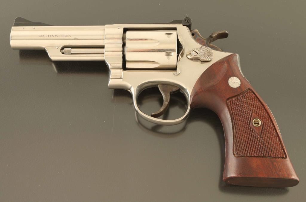 'No Dash, Pinned & Recessed' Double/single action revolver manufactured circa 1960. Features nickel finish, checkered wood target style grips with S&W medallions, 4" barrel, adjustable sights with ramp front blade, case colored grooved wide trigger, case colored checkered wide spur hammer. Bore and charge holes are very good or better condition. Nickel finish is very good, appearing a bit cloudy from many tiny scratches, no visible peeling or flaking. Trigger & hammer are case color, excellent with bright color. Wood grips are very good. Action is smooth with tight lock-up. Condition is NRA Very Good++ *** Modern Firearm ***