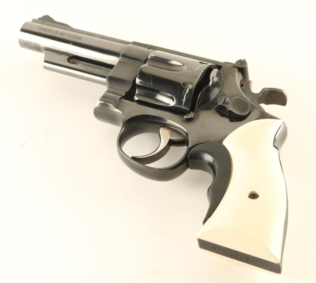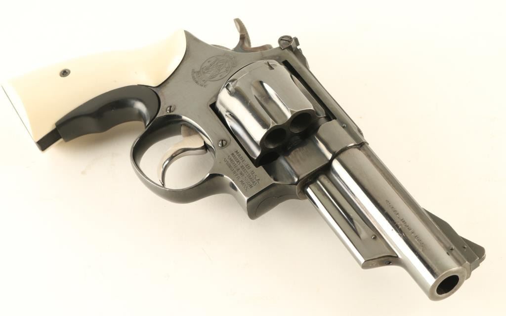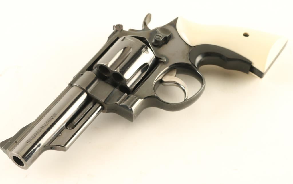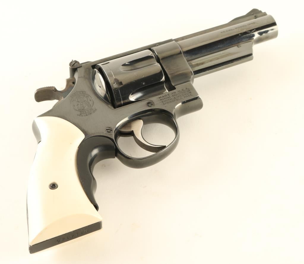 Large frame double/single action revolver features blued finish, 4" barrel, adjustable sights, ejector rod shroud under barrel, white faux ivory polymer grips, Tyler "T" grip adapter, wide checkered spur target type hammer. Bore and charge holes are very good condition. Retains 85% deep blue with small scratches and some rubbing on sharp edges. Sides and front face of case color trigger has been smoothed and polished for a smoother feel to trigger finger. Small amount of paint added to rear face of front sight. Grips and grip adapter are fine. Action is smooth with tight lock-up. Accepts 45 ACP ammo in full moon, half moon, or other clips; single cartridges will not be ejected by the ejector star. Condition is NRA Very Good *** Modern Firearm ***