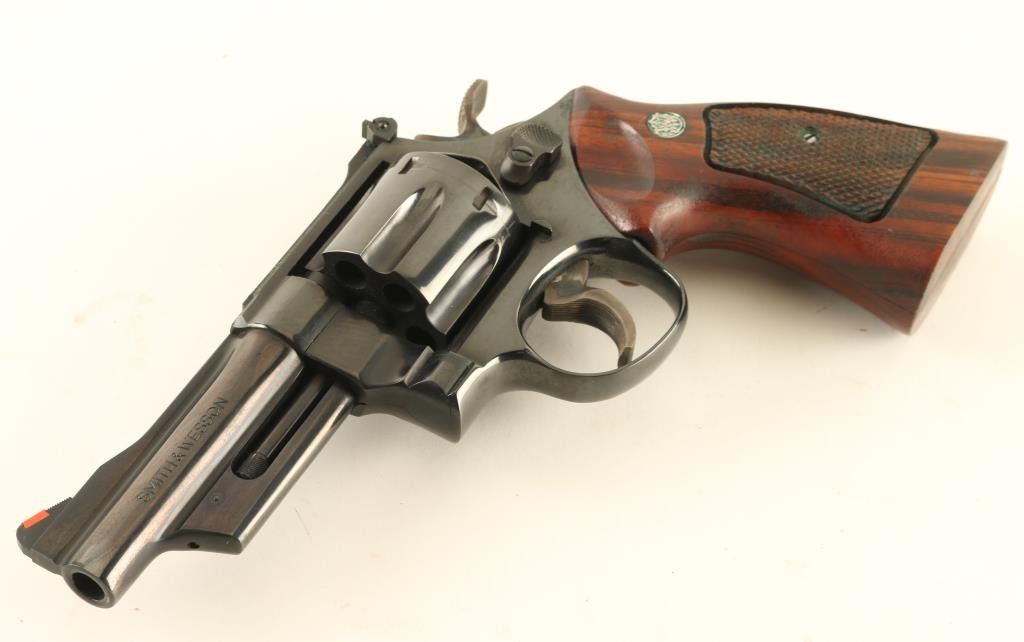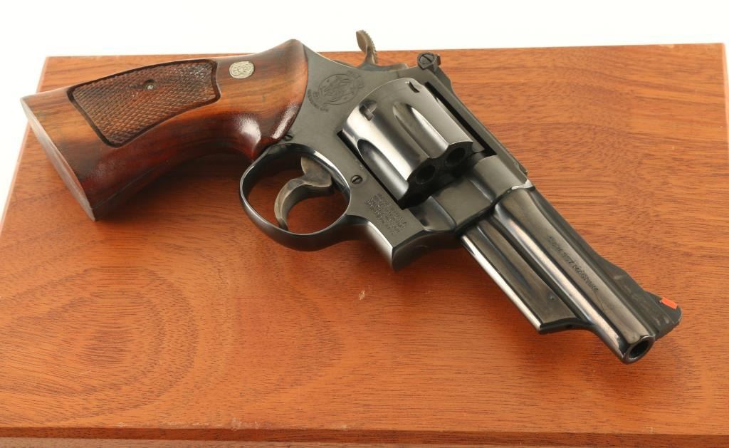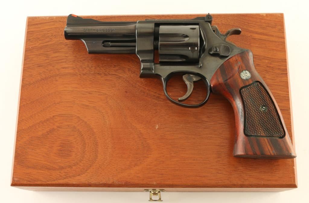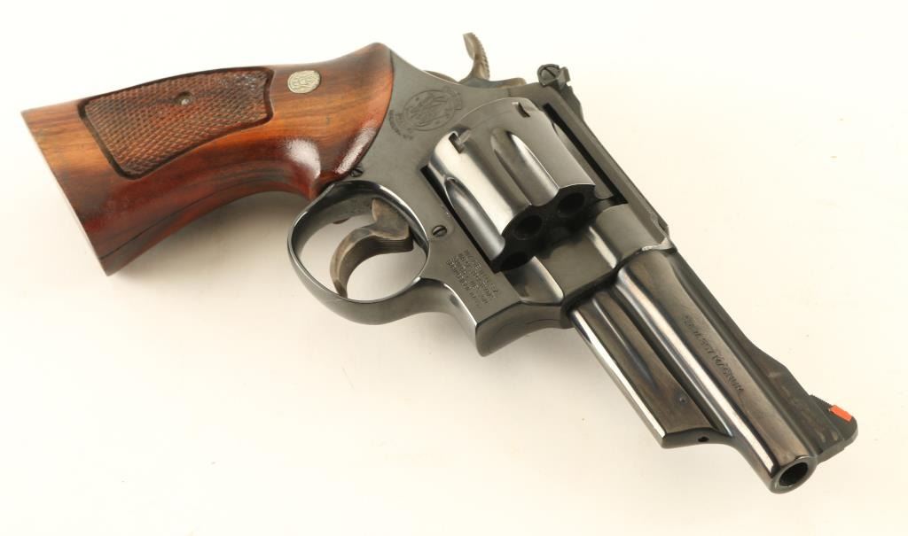 SN: N885932 Large frame double/single action revolver features blued finish, checkered wood target grips with S&W medallions, 4" barrel, adjustable sights (red ramp front, white outline rear), wide checkered spur target hammer. Bore and cylinder charge holes are very good condition, need cleaning. Retains 95% blue, with cylinder drag line, minor handling marks. Grips are near excellent. Includes wood storage box with hinged lid, plastic inset with shape of revolver, lidded storage compartment with S&W factory cleaning items. Condition is NRA Excellent *** Modern Firearm ***