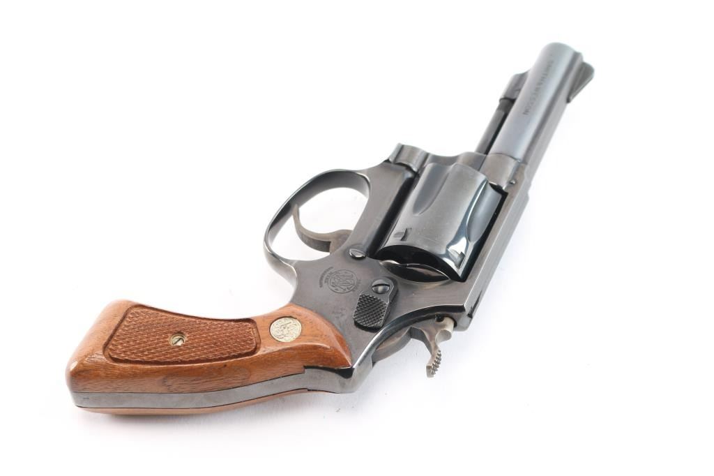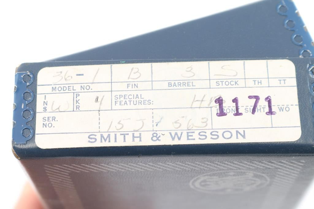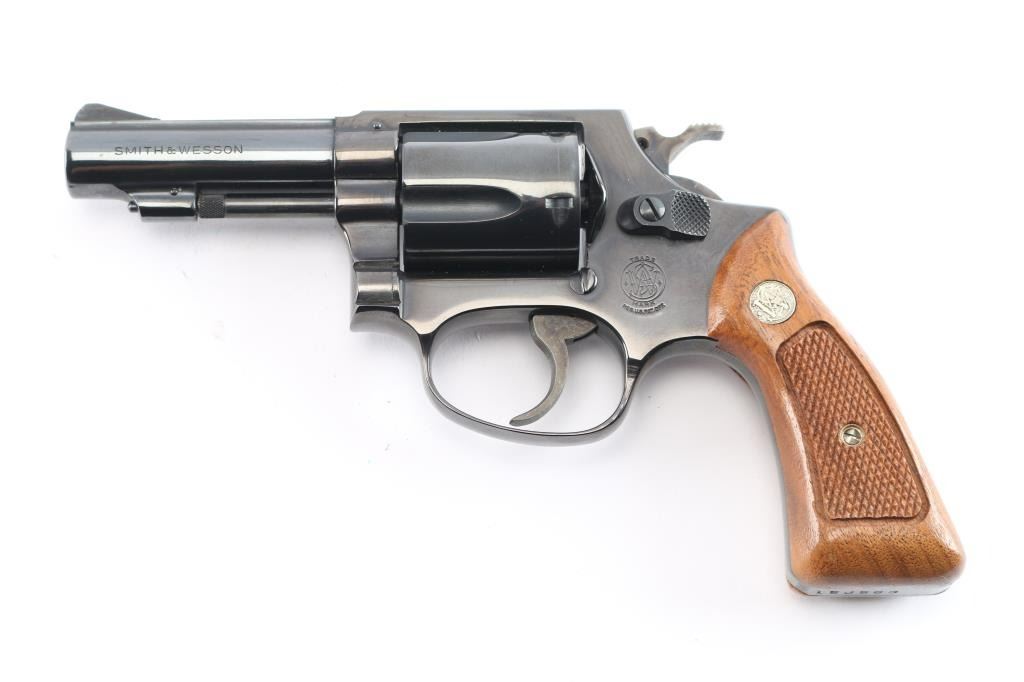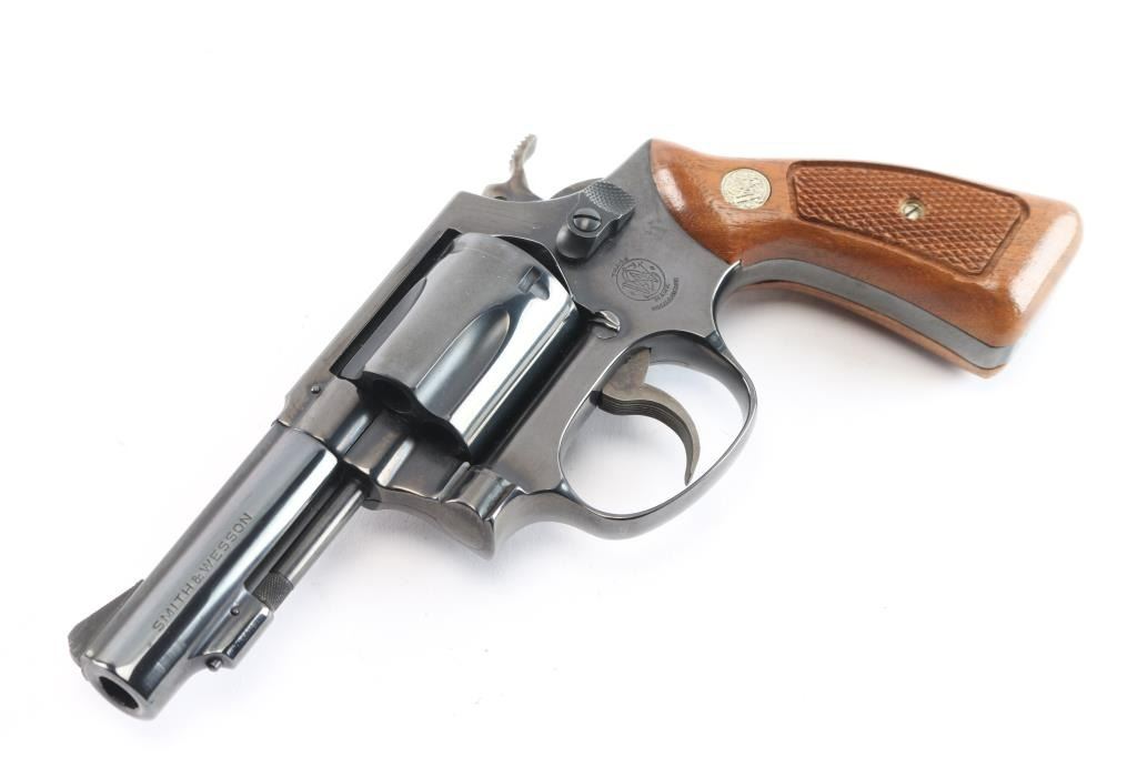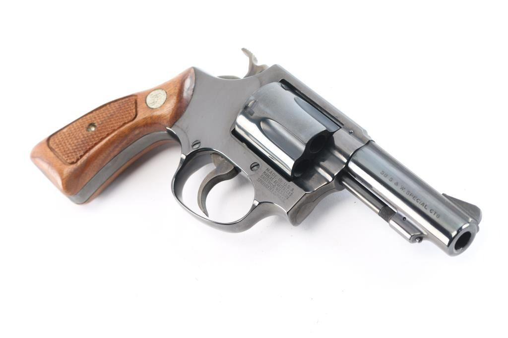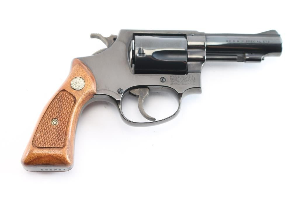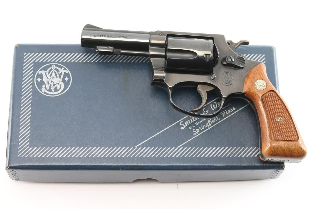 American made 'The .38 Chiefs Special' small frame double action revolver chambered in .38 Special. Manufactured in Springfield, MA, between 1968 and 1982, with the heavy barrel standardized in 1975. Features a blued finish with case colored serrated curved trigger, checkered service hammer with exposed firing pin, 3" barrel, non-shrouded ejector rod, serrated ramp front sight, square notched rear sight, fluted five-shot cylinder, checkered wood Magna grips with S&W medallions. Retains approximately 99% finish with no apparent edge wear or other losses. Action is smooth with very good lock-up, the bore is excellent with strong rifling, cylinder chambers are excellent, and the grips have no loss. Comes with factory box, manual, and bore brush. Manufactured early 1980's.