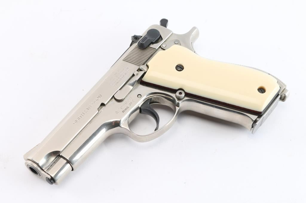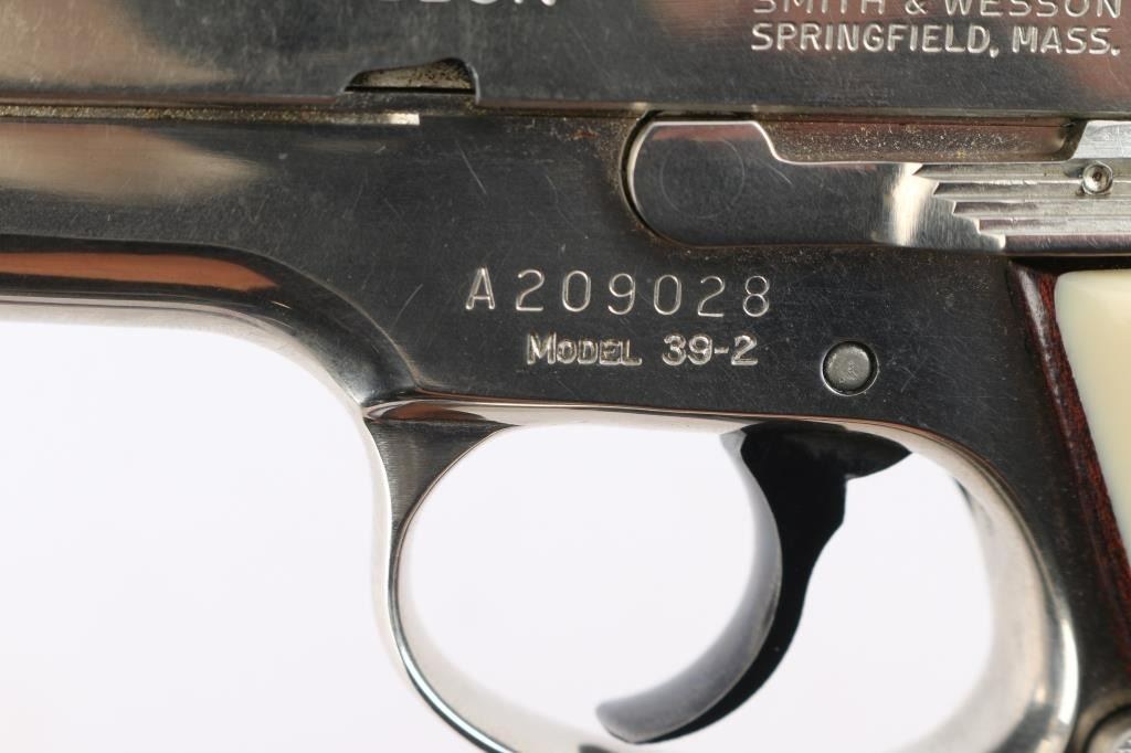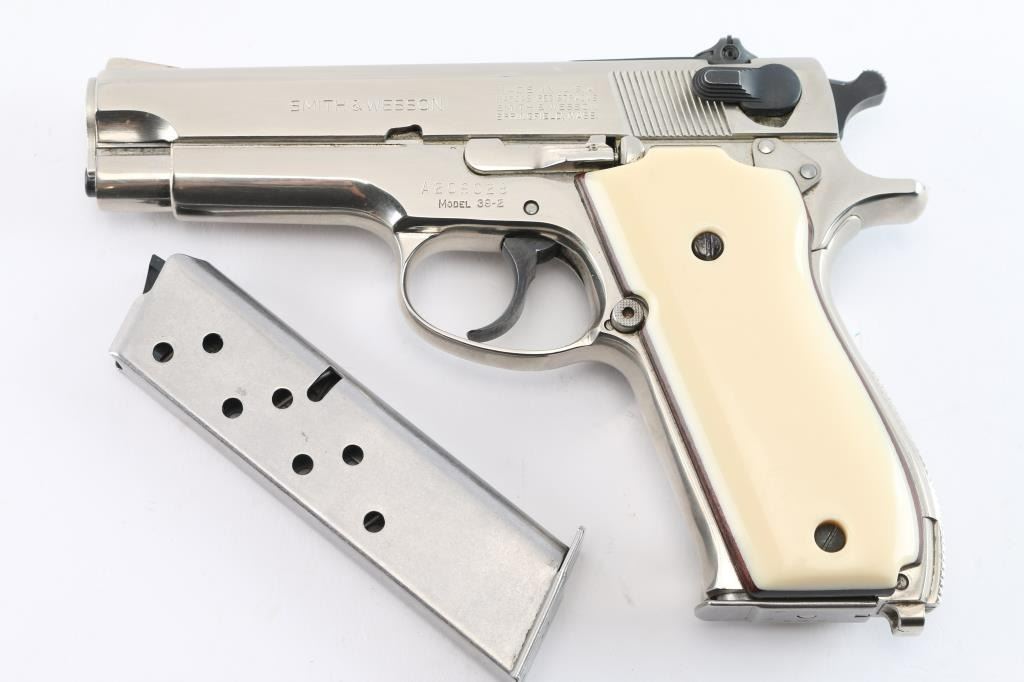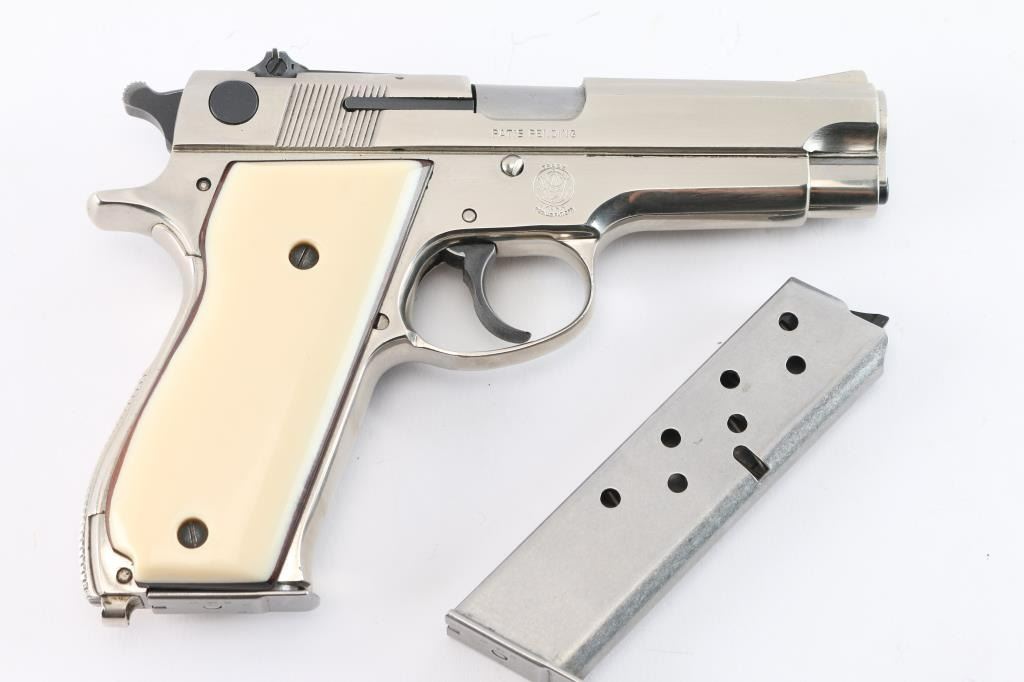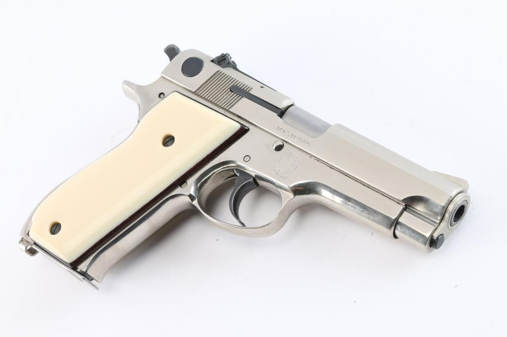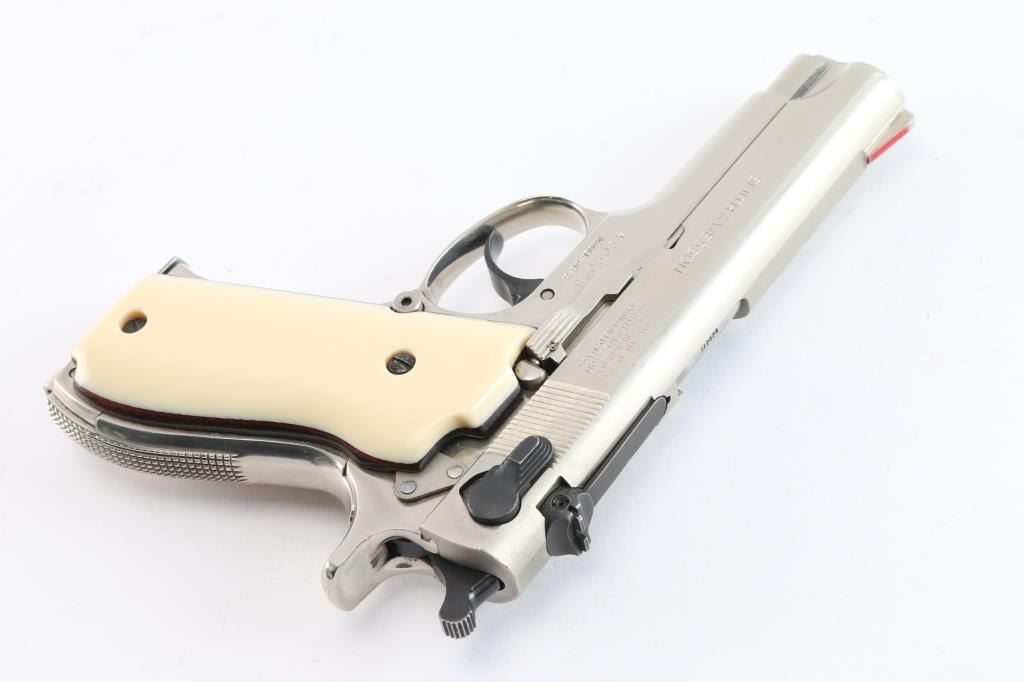 American made double action semi-automatic pistol chambered in 9x19mm. Manufactured circa 1979-1980. Features a bright nickel plated finish with a matte slide top, blued controls, carbon steel slide, 4" barrel, full-length steel guide rod, serrated ramp front sight (red paint), windage adjustable micrometer click rear sight, smooth curved trigger, serrated round hammer spur, thumb safety/decocking lever on the left side of the slide, magazine disconnect safety, push button magazine release, factory 8 round magazine, aluminum alloy frame, checkered alloy backstrap with lanyard loop and two-piece smooth faux ivory white grips with wood spacer on the insides. Pistol exhibits superficial scratches, and minor edge wear on the blued controls with more significant wear on the hammer spur. The finish is approximately 90% with discoloring on the rear of the slide, beaver tail, and along the backstrap down to the lanyard loop. The action is mechanically sound, the bore is very good, and wood grips are very good with only one extremely small nick on the right panel towards the bottom rear. There is a spot of rust on the rear sight tang. It comes with one spare magazine.