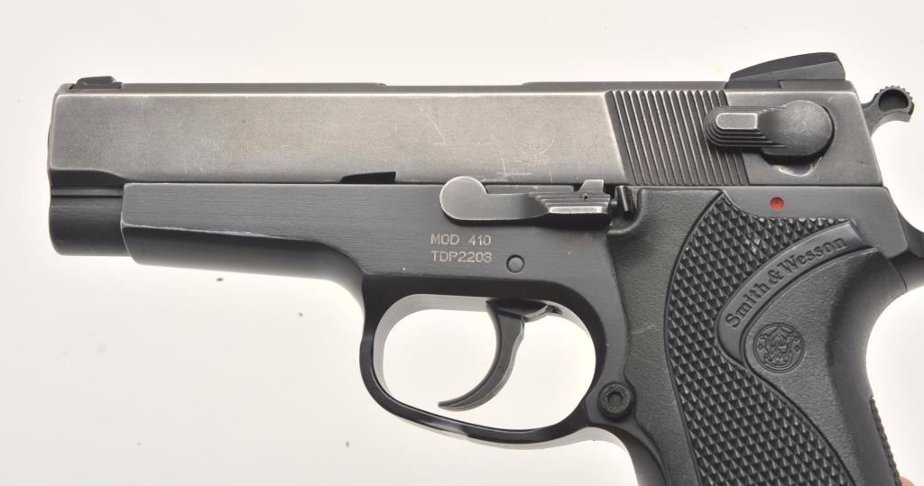 Smith & Wesson Model 410 semi-automatic pistol, .40 S&W caliber, 4” barrel, grey and black dual finish, checkered black grips, S/N TDP2203, in overall very good condition with a very good bore, crisp action, very goodmarkings and good grips displaying scattered handling scratches. (Modern/No PPT/NO CALIF. SALE). Est.: $250-$500.