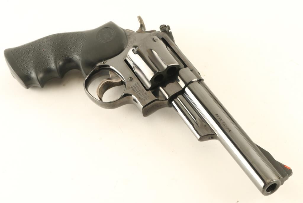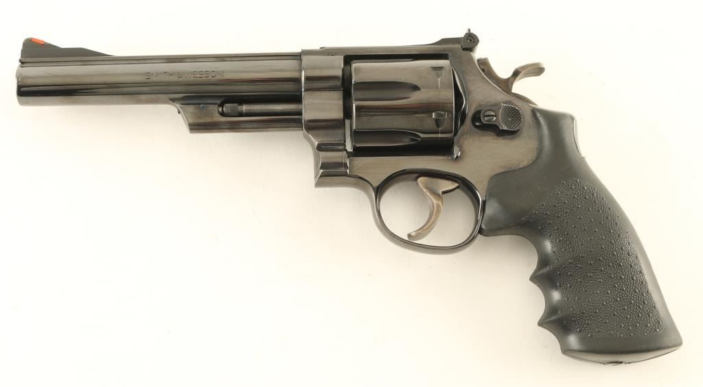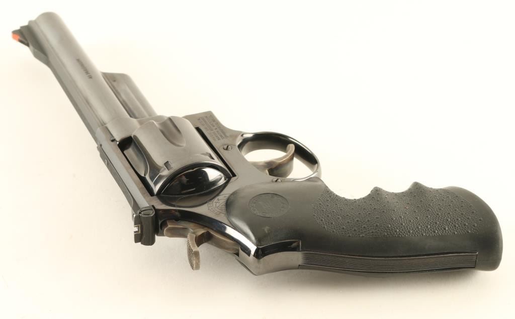 "Pinned & Recessed" double/single action revolver features blued finish, black rubber contoured Hogue Monogrip, 6" barrel, red ramp front sight, white outline adjustable rear sight, wide grooved trigger, wide checkered spur hammer. Bore is excellent, cylinder charge holes appear smooth. Retains 90% blue with drag line and small scratches on cylinder, scratches to top rib, bare metal at muzzle. Action is smooth with tight lock-up. Condition is NRA Very Good ++ *** Modern Firearm ***