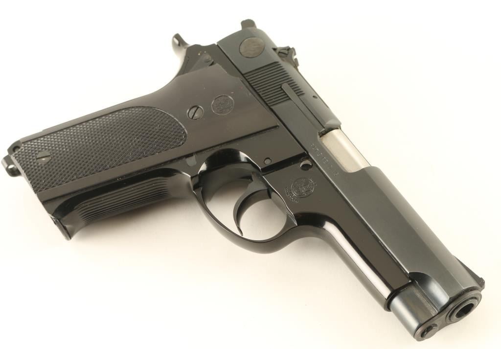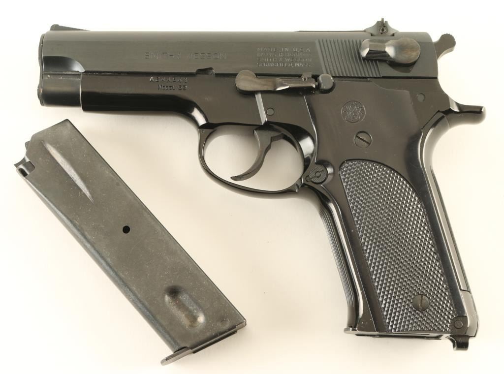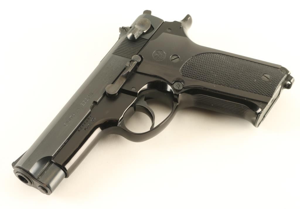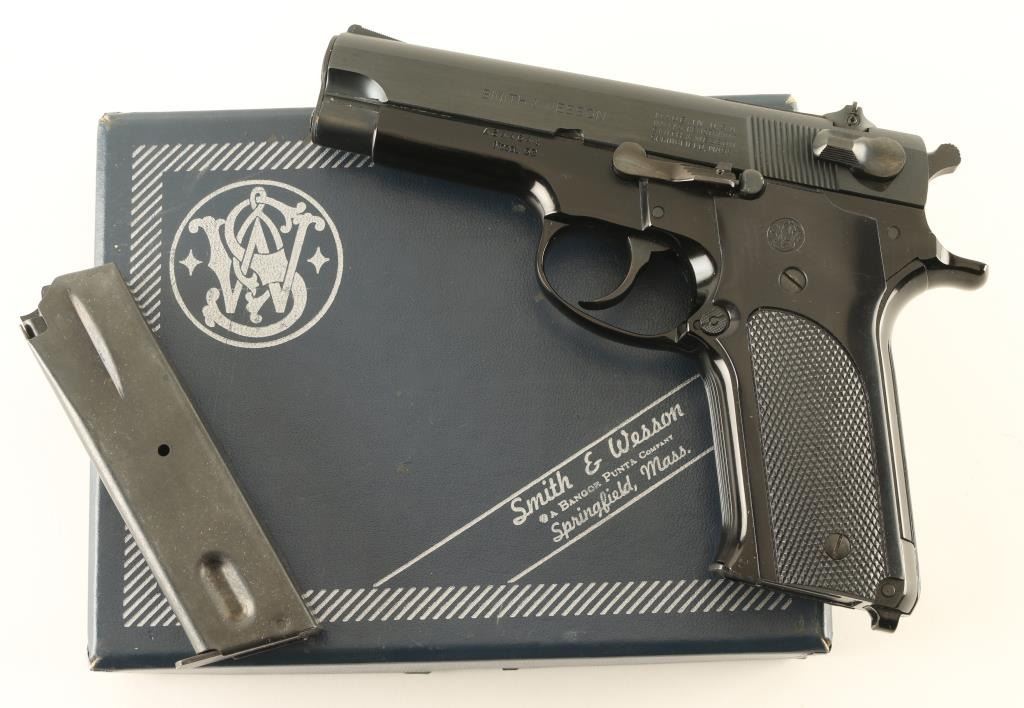 Semiautomatic pistol features blued steel parts, black finish alloy frame, checkered black plastic grips embossed with S&W logo, 4" barrel, adjustable sights ("lollypop" style rear sight), slide mounted manual safety/decocker, magazine safety, push button magazine release. Bore is very good to excellent condition. Retains 95% finish with rub marks at front of slide. Grips are excellent with fine scratches. Includes total of (2) magazines, factory paperwork, very good condition blue & silver S&W cardboard box. Condition is NRA Excellent *** Modern Firearm ***