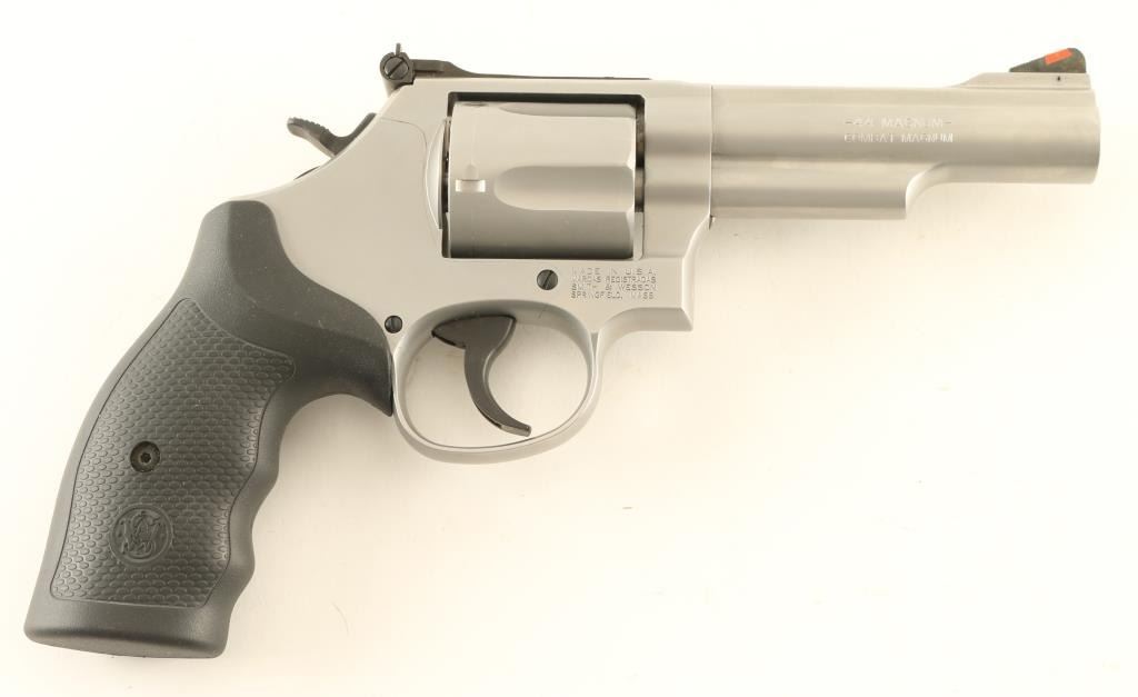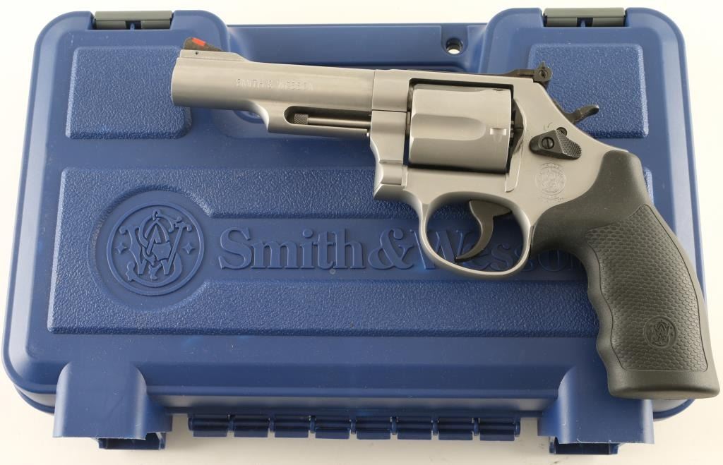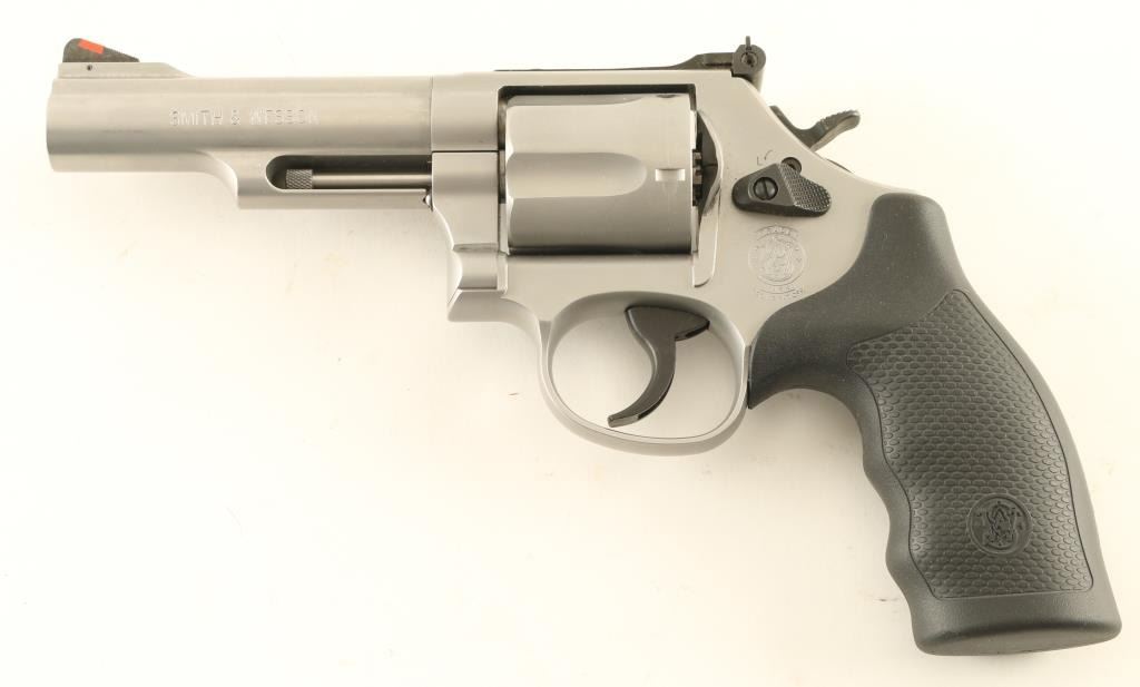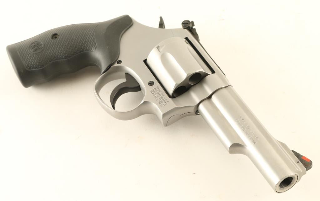 Double/single action revolver features stainless steel construction, black rubber contoured grip with S&W emblem, 4" barrel, orange ramp front sight, white outline rear adjustable sight, smooth faced trigger, checkered spur hammer, S&W locking system. Bore is excellent, cylinder charge holes appear smooth. External appearance is almost like new, with a few scratches on barrel, drag line on cylinder. Action is smooth with tight lock-up. Includes S&W hard case with manual, locking system keys. Condition is NRA Excellent *** Modern Firearm ***
