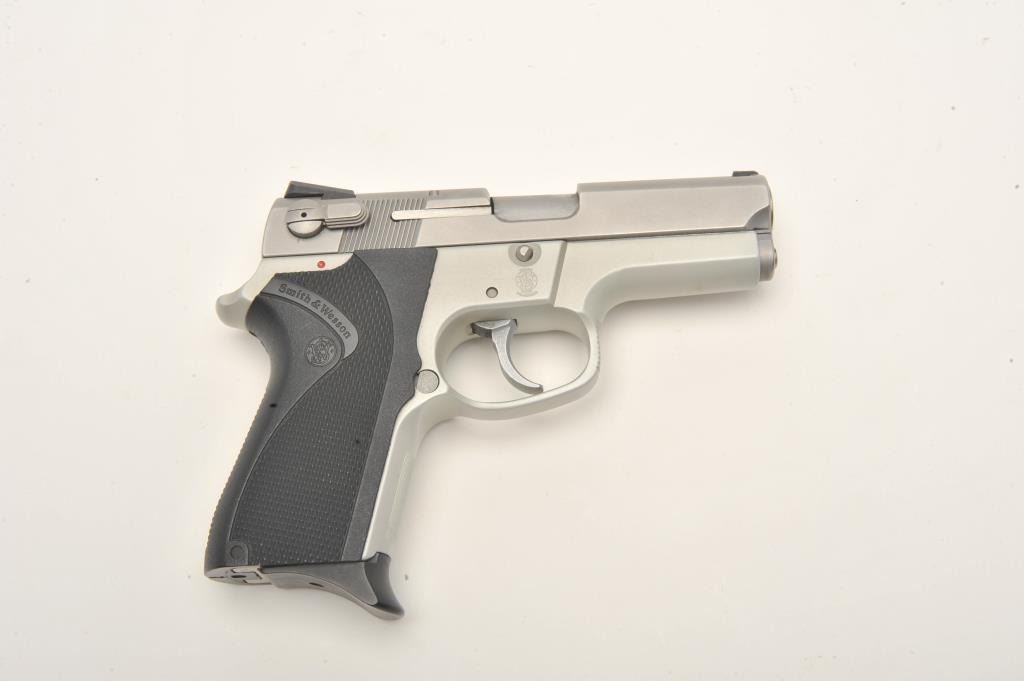Smith & Wesson Model 6906 semi-automatic pistol, 9mm caliber, 3.5” barrel, stainless, checkered grips, S/N TFK7041, in overall fine condition with a fine bore, crisp action, sharp markings and fine grips; accompanied by a Bianchi black leather holster. (Modern/No PPT/NO CALIF. SALE). Est.: $300-$600.
