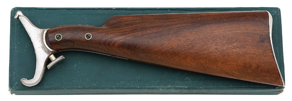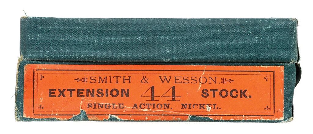 This original stock retains 98-99% original nickel finish, showing minor high edge wear and scattered light oxidation staining with a few minor dings about the original nickel buttplate. The smooth walnut stock shows scattered light dings and handling marks relative to its age and remains in fine overall condition. The tang screws have toned to even gunmetal patina and very mild verdigris can be seen forming in the screw escutcheons. Included is the original green paper-covered box with orange end label which remains in excellent condition, showing very light edge and corner wear with the label remaining largely legible and intact with a flaking along the bottom edge. (26B10826-201) [Dr. W. Lloyd Hudson Jr. Collection] (1500/2000)