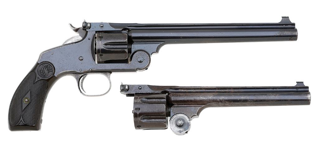 serial #848 (cylinder), 32-44 S&W and 44 S&W Russian, 6 1/2'' 32-44 barrel with a partially bright very good bore showing scattered light pitting and oxidation with otherwise strong rifling and 8'' 44 barrel with a bright excellent bore. This is an interesting revolver showing just an ''8'' on the frame (obscured due to an added screw) and ''848'' on the 44 S&W cylinder and the 32-44 cylinder, barrel and latch. The 44 barrel is stamped only with a ''2'' and its latch is un-numbered. The 44 barrel is currently installed and the metal surfaces retain about 65-70% original bright blue with scattered flaking toning to mild gray-brown patina, some light dings and oxidation staining, and the cylinder flats with moderate wear. The hammer retains fine case-hardened colors while the triggerguard is a pleasant smoky gray and the barrel shows simplified address and cartridge designation on the left side. There is an added partially drilled hole and another added small screw along the front gripstrap. The checkered black hard rubber grips remain in very fine condition showing some scattered light dings and slight toning to brown. Both sets of barrels are equipped with factory target sights and the 32-44 target barrel and cylinder retain perhaps 40% original bright blue with the balance flaked and toned to medium gray-brown patina showing some scattered oxidation speckling and pinprick pitting. The barrel rib shows crisp two-line address and patent dates. Barrel-to-frame fit is solid and the action generally seems to function well mechanically, the 44 cylinder very sporadically not timing correctly. An interesting combination set for the Smith & Wesson collector. (13B10826-604) {ANTIQUE} [Dr. W. Lloyd Hudson, Jr. Collection] (3500/5000)