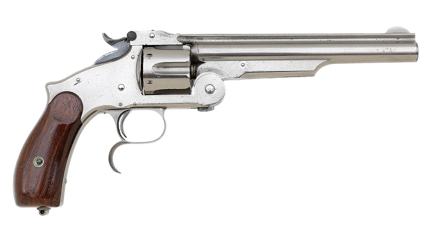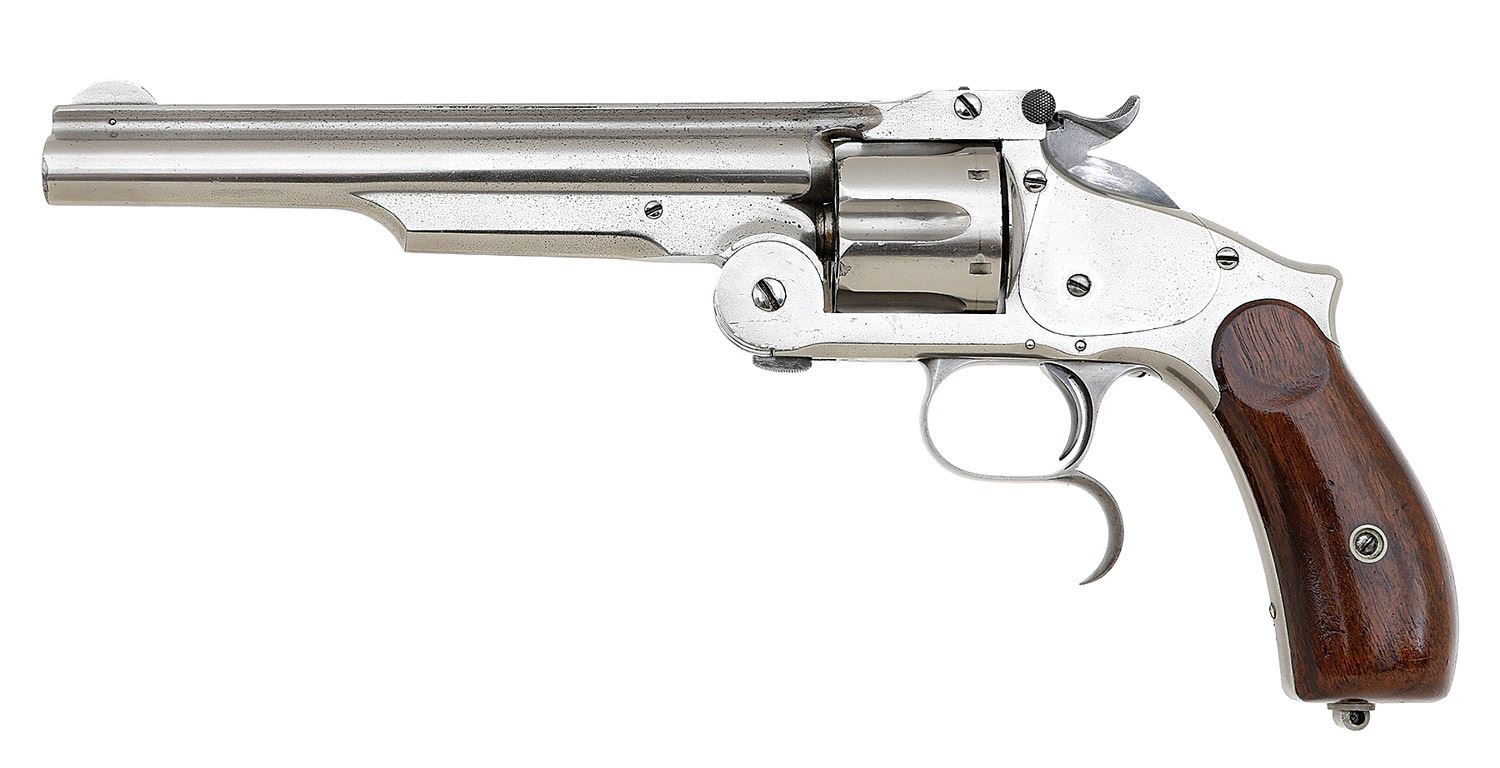 serial #37808, 44 S&W Russian, 7'' barrel with a bright very fine bore showing a few small areas of light oxidation and pinprick pitting with otherwise strong rifling throughout. The metal surfaces retain about 94% antique nickel finish which has acquired an honest slightly clouded appearance overall and very much appears to be original showing some scattered light dings, small tool marks and light flaking toning to mild gray patina. The hammer and spur triggerguard retain generous original case-hardened colors drifting to smooth gray while the latch and trigger show fine dark gray oil-quenched case-hardening. Curiously, a small hole has been added at the bottom of the frame behind the hinge hardware both inside and out, appearing to be some sort of ad-hoc oil hole. The single line barrel address and patent dates remain strong, there is a ''SH'' Schuyler, Hartley & Graham retailer stamp at the heel and the barrel and inside of the frame between the locking posts show a small ''*'' stamp. The smooth walnut grips remain in excellent condition showing a few light handling marks and the right panel properly stamp-numbered matching the frame by serial number. The remaining numbered parts are matching by assembly number and the lanyard stud is missing the ring. Barrel-to-frame fit is solid and the hand or its spring will require attention as it does not come up properly to cycle the cylinder. The hammer otherwise functions crisply. (13B10826-242) {ANTIQUE} [Dr. W. Lloyd Hudson, Jr. Collection] (2000/2500)