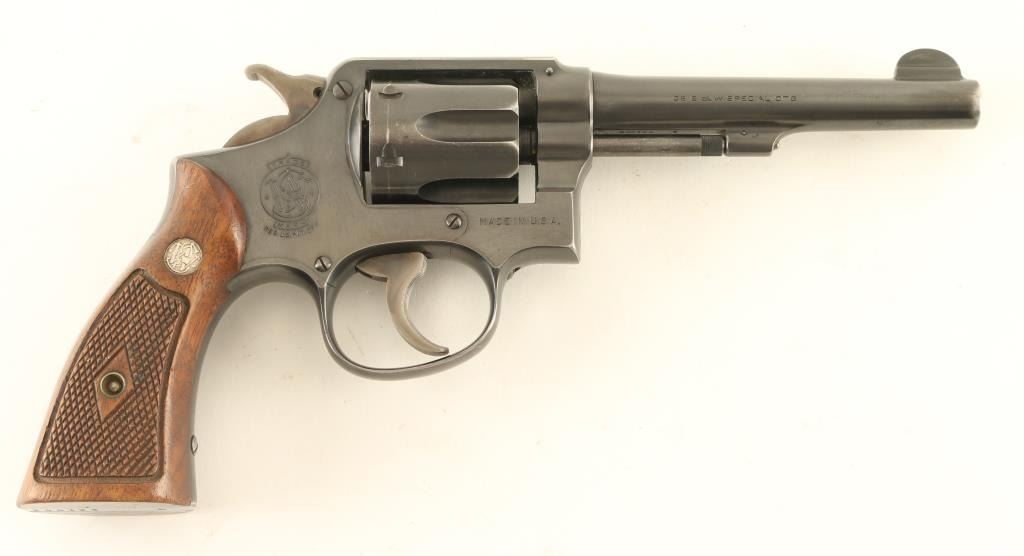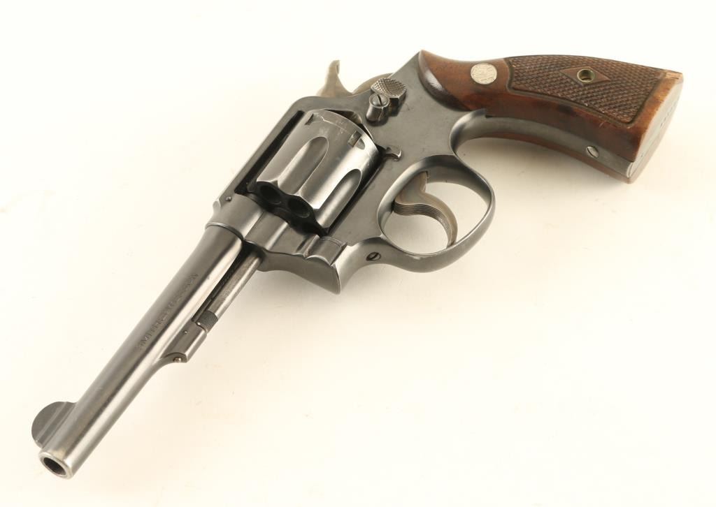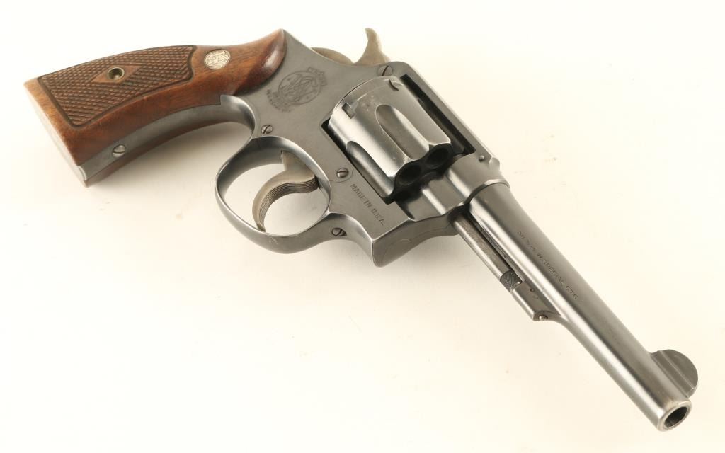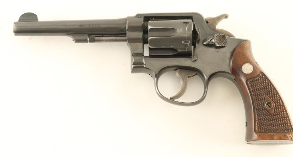 '.38 Military & Police' double/single action revolver manufactured circa 1952. Features blued finish, checkered wood "magna" style grips with S&W medallions, 5" pinned barrel, fixed sights, case colored grooved narrow trigger, case colored checkered narrow spur hammer. Bore and charge holes are very good condition. Retains 80% blue with bare metal showing at most sharp edges & cylinder drag line, small spots of patina in a few places. Grips are good condition with chip out of left side at butt. Action is smooth, lock-up is good. Condition is NRA Very Good *** C&R Firearm ***