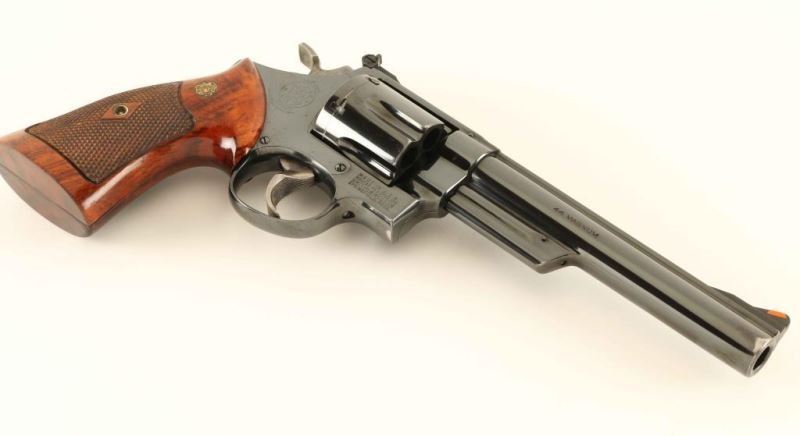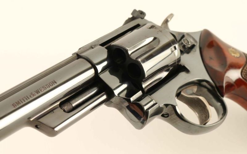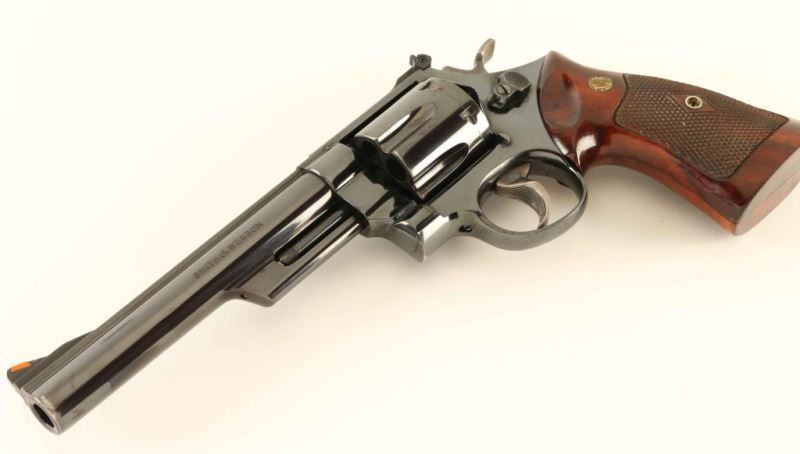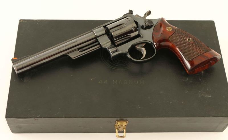 'The .44 Magnum' Vintage large frame double action revolver chambered in .44 Magnum, manufactured circa 1957. Features a polished blued finish, pinned 6 1/2" heavy barrel with partially serrated wide sighting rib, raised ramp front sight with red insert, adjustable micrometer click rear sight with white outline, fluted six-shot cylinder with counterbored chambers, shrouded ejector rod, .500 serrated target trigger, .500" target hammer, four screw square butt N target frame with ten-groove grip straps and two-piece diamond checkered Goncalo Alves target grips with silver S&W medallions. Includes a factory black pebble grain leatherette presentation case with a blue satin lined fitted interior and clasp style latch. Revolver exhibits approximately 93% of it's bright blued finish with edge wear, bright drag line on the cylinder, some scattered freckles of emerging surface rust on the cylinder and a few imperfections in the metal observed under the finish. The barrel & cylinder also display a slight plum hue. Action is smooth with very good lock-up, the bore is pristine, and the refinished wood grips are good. Condition in near NRA Very Good in case. ***C&R Firearm***