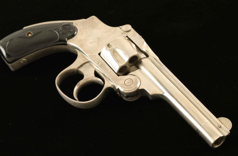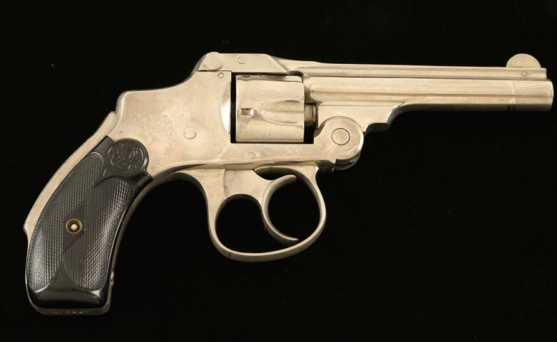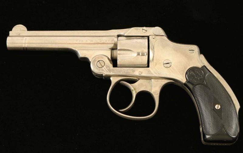 SN: 175297 '3rd Model Lemon Squeezer' Vintage double-action-only top break revolver chambered in .32 Smith & Wesson, circa 1909-1937. Features a nickel plated refinish, 3 1/2" ribbed barrel, pinned round blade front sight, 'u' notched rear sight, fluted five-shot cylinder, smooth trigger, concealed hammer, knurled grip safety and two-piece fancy checkered black hard rubber grips with S&W monograms. Serial numbers match on the frame, barrel latch, cylinder & extractor. Revolver retains nearly all of it's nickel plated refinish which exhibits a cloudy appearance. Action performs well with very good lock-up, bore is poor and the hard rubber grips are good with blemished & semi-worn points. Condition is NRA Fair to Good. ***C&R Firearm***