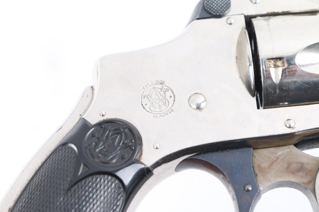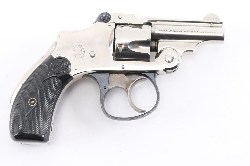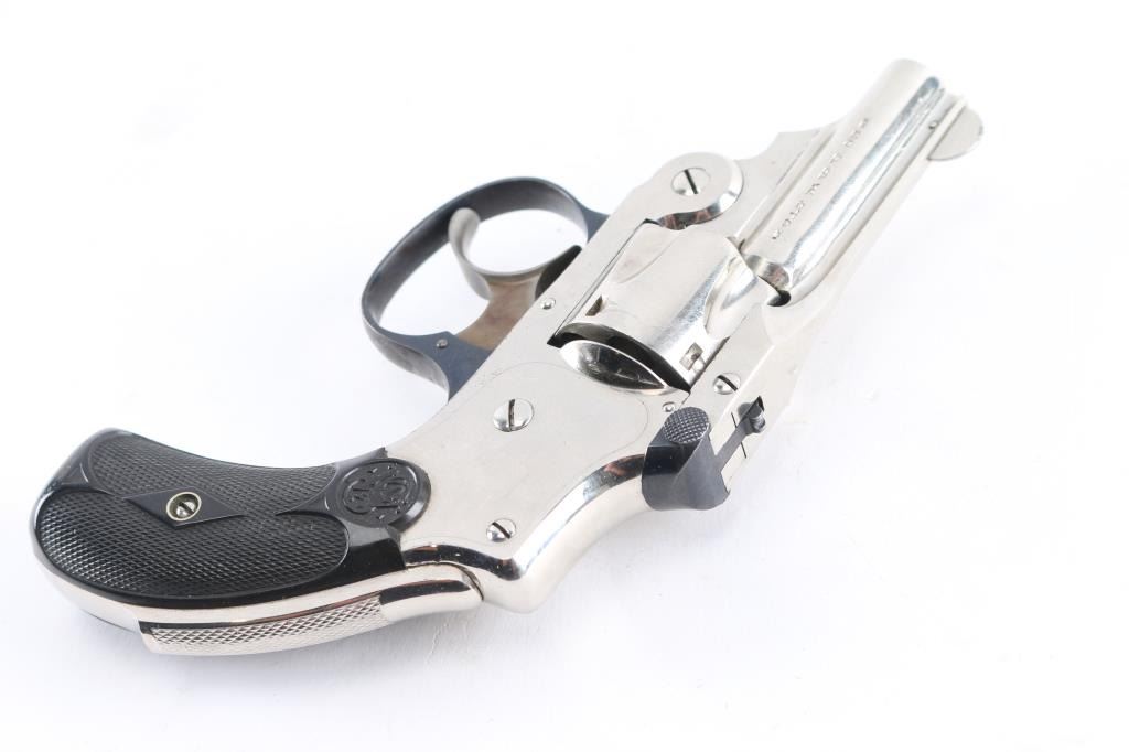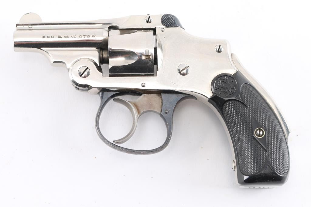 SN: 164736. The "Bicycle Gun" with scarce 2" barrel for dog defense. 2nd Model, vintage double-action-only top-break concealed hammer revolver chambered in .32 Smith & Wesson, manufactured in Springfield, MA circa 1902-1909. The right side of the barrel is stamped with the one-line address marking, the left side of the barrel has the caliber marking, and the right side of the frame has the S&W logo. Matching serial numbers are on the butt, right grip panel, cylinder, underside of star, and barrel latch. Inventory number "11294" is stamped on the front rounded part of the heel, not period done, possibly a museum Features a nickel plated finish, rare ribbed 2" barrel, pinned round blade front sight, u notch rear sight cut in the raised portion of the barrel catch, pull up barrel latch, fluted five-shot cylinder with automatic extractor, case hardened smooth crescent trigger, blued trigger guard, cylinder star, & barrel latch, concealed hammer, knurled grip safety and diamond checkered hard rubber grips with molded S&W monograms. Revolver retains approximately 98% of its nickel plated finish showing scattered scratches, no flaking. Action is sound with very good lock-up, the bore is excellent/bright and the hard rubber grips are excellent, blued parts are excellent. Not many found in this condition. Condition is NRA -Very Good. C&R Firearm.