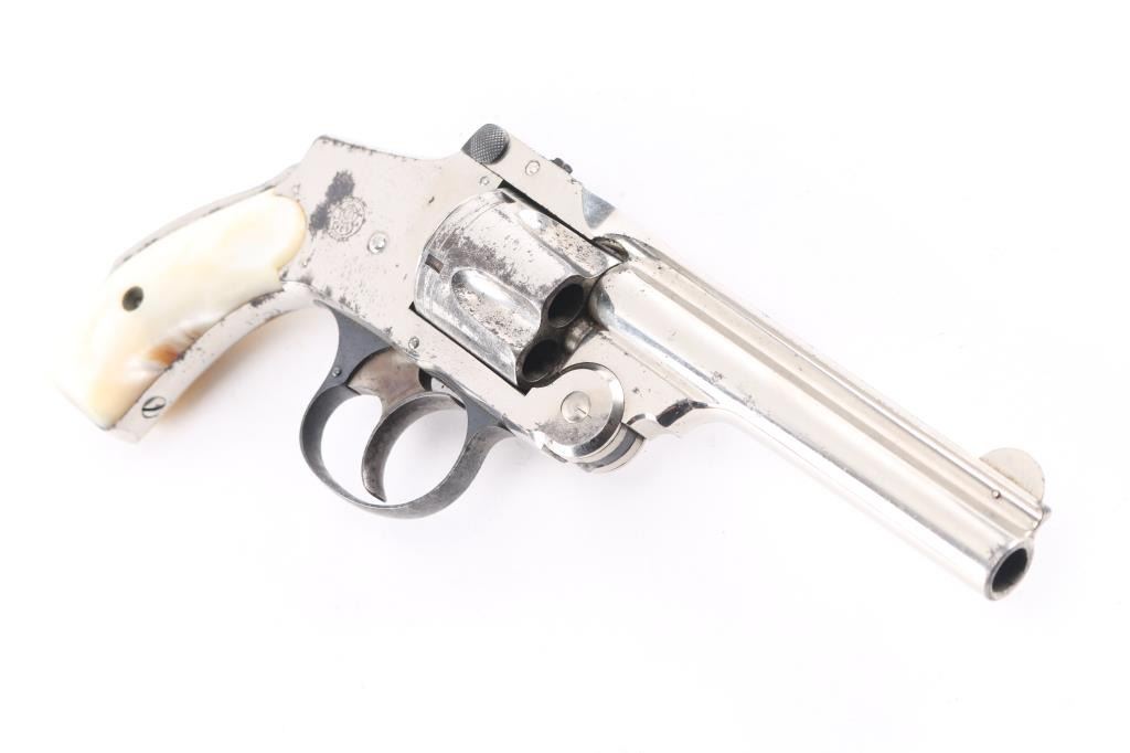 SN: 201890 '4th Model' Vintage top break revolver chambered in .38 S&W, circa 1898-1907. 'Lemon squeezer'. Features a nickel plated finish, blued triggerguard, 4" ribbed barrel, forged round blade front sight, 'u' notched rear sight, fluted five shot cylinder, smooth trigger, backstrap safety and Mother of pearl grips. All serial numbers are matching. Revolver exhibits approximately about 70% of it's original nickel plated finish showing edge wear, scattered losses and patches of pitting. Action is smooth with very good lock-up, bore is has good rifling with scattered light pitting. Mother of pearl grips are good with no chips, or cracks. NRA Condition is good. C&R Firearm.