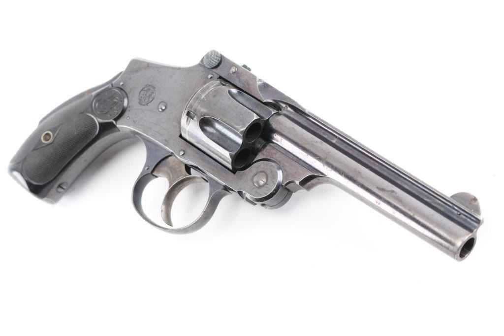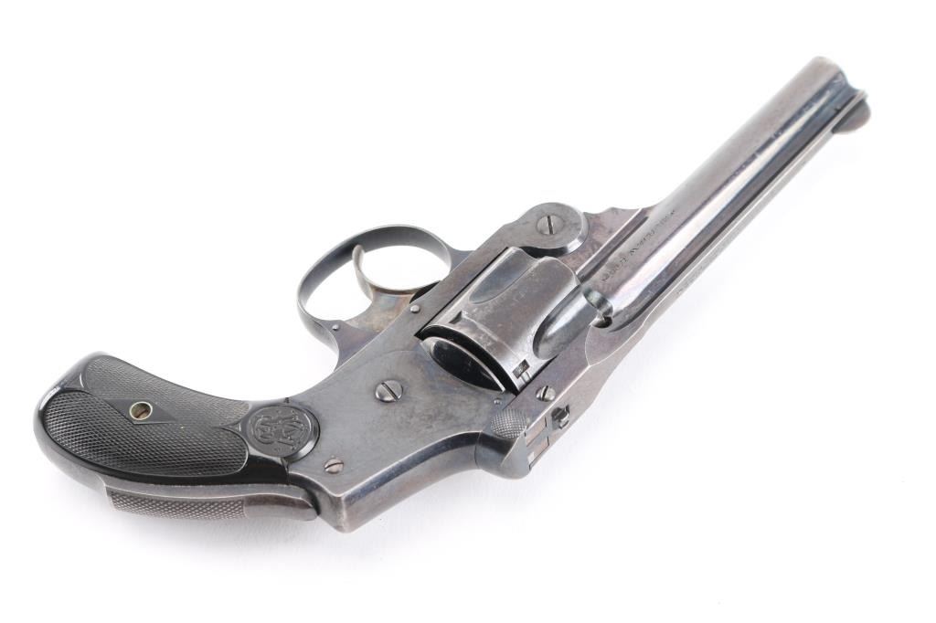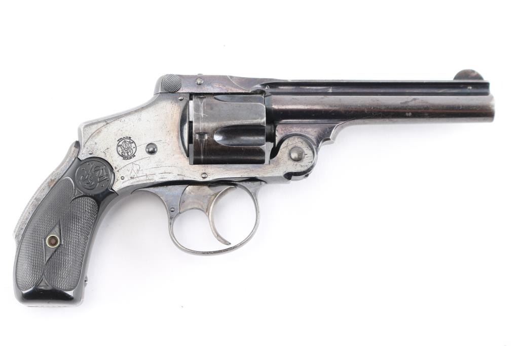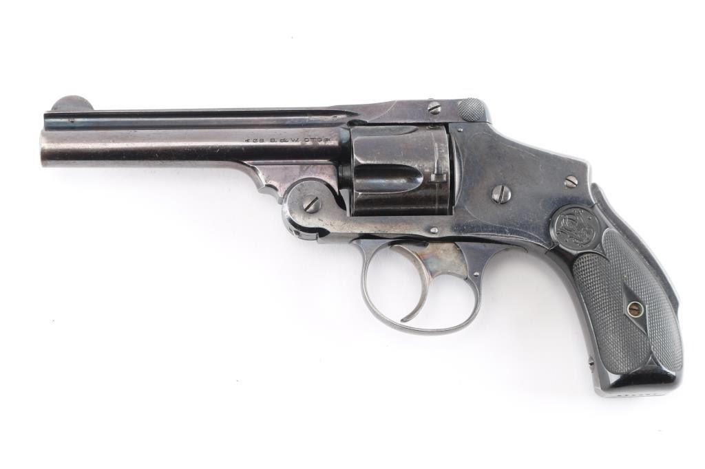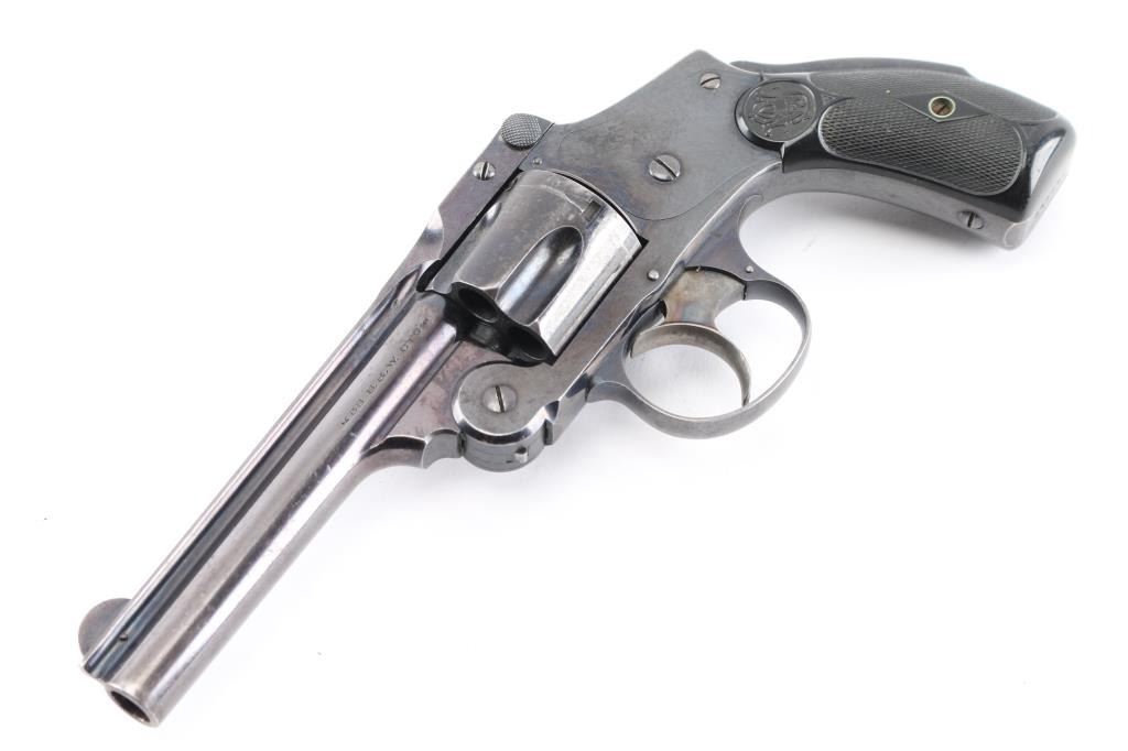 SN: 155028 The "Lemon Squeezer" 2nd model manufactured 1902-1909. Double action only. 5-shot, 4" round, ribbed barrel, blue finish, checkered hard rubber grips with S&W monograms. T-shaped barrel latch with Knurling on each side. Top break action. Grip safety. Bore is excellent/bright. Action is smooth, barrel locks up tight, Serial number matched on heel. barrel latch, and cylinder. Grips are excellent, blue finish is about 75% with holster/edge wear, scratches, handling wear to the grip safety. Trigger retains most of the case color. Great condition for ot's age.