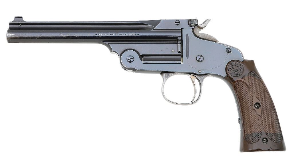 serial #3331, 22 LR, 6'' barrel with an bright excellent bore. This fine pistol retains about 95% original bright blue showing edge wear, handling marks, and light thinning on the straps. The hammer and triggerguard retain strong case-hardened colors with operational wear while the trigger is bright. The un-numbered diamond checkered factory hard rubber extension grips feature S&W monograms, they rate excellent although they are toning to brown which is most prevalent on the left panel. This lovely gun features a Paine front sight, adjustable rear sight, and the barrel, latch, and extractor are correctly numbered to the gun. Barrel to frame fit is tight and the action remains crisp. A nice example. (8A10826-636) {C&R} [Dr. W. Lloyd Hudson, Jr. Collection] (1000/1500)