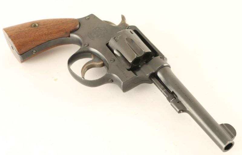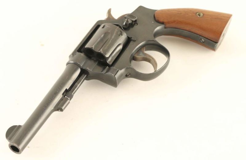 SN: 918173 '.38/200 British Service Revolver' Medium frame double action revolver chambered in .38 Smith & Wesson, manufactured circa 1940-1945. Features a blued finish, pinned 5" barrel, forged round blade front sight, square notched rear sight, non-shrouded ejector rod, fluted six-shot cylinder, serrated .265" trigger, .265" hammer with knurled spur, five screw square butt K frame without lanyard ring and two-piece smooth walnut grips. Shows U.S. proofs only. Revolver exhibits approximately 93% of it's original blued finish showing scattered losses and handling marks/blemishes. Action is crisp with good lock-up, the bore is pristine, markings are sharp and the wood grips are very good with a small loss on the butt of the right panel. Condition is NRA Fine. ***C&R Firearm***