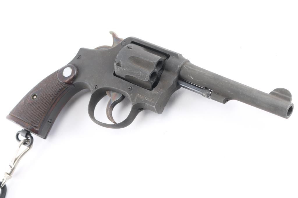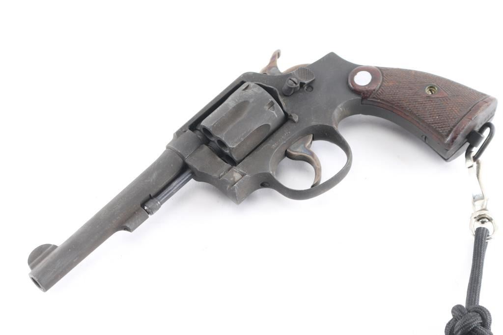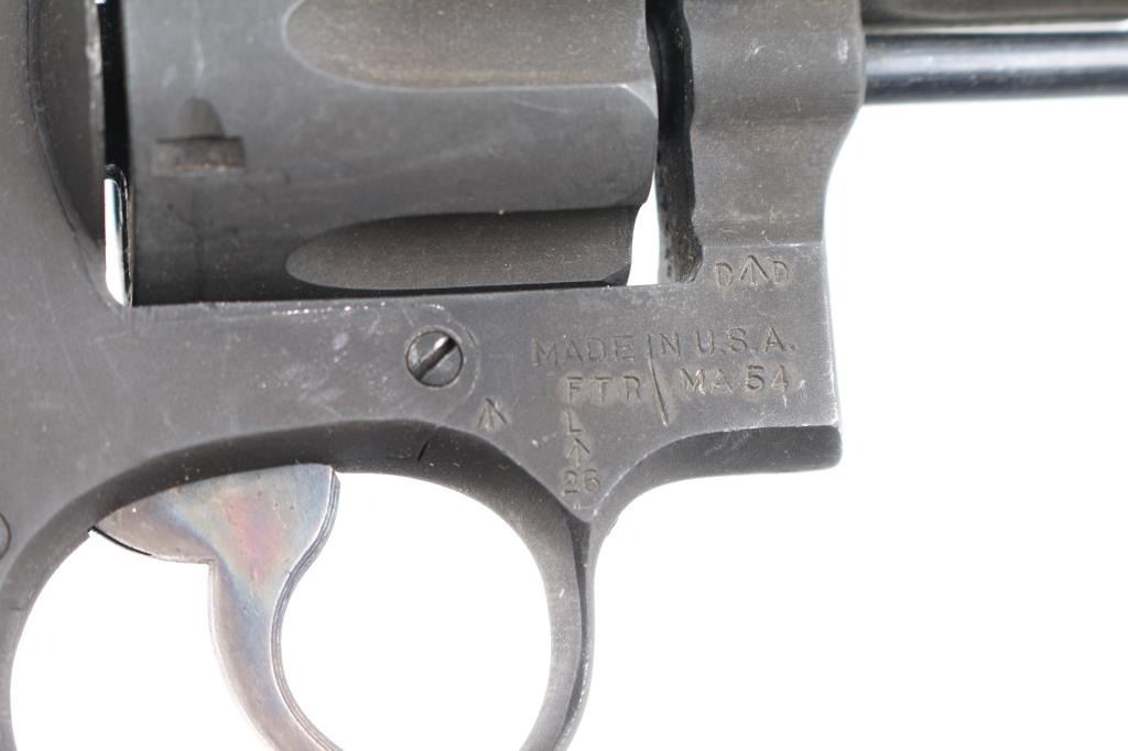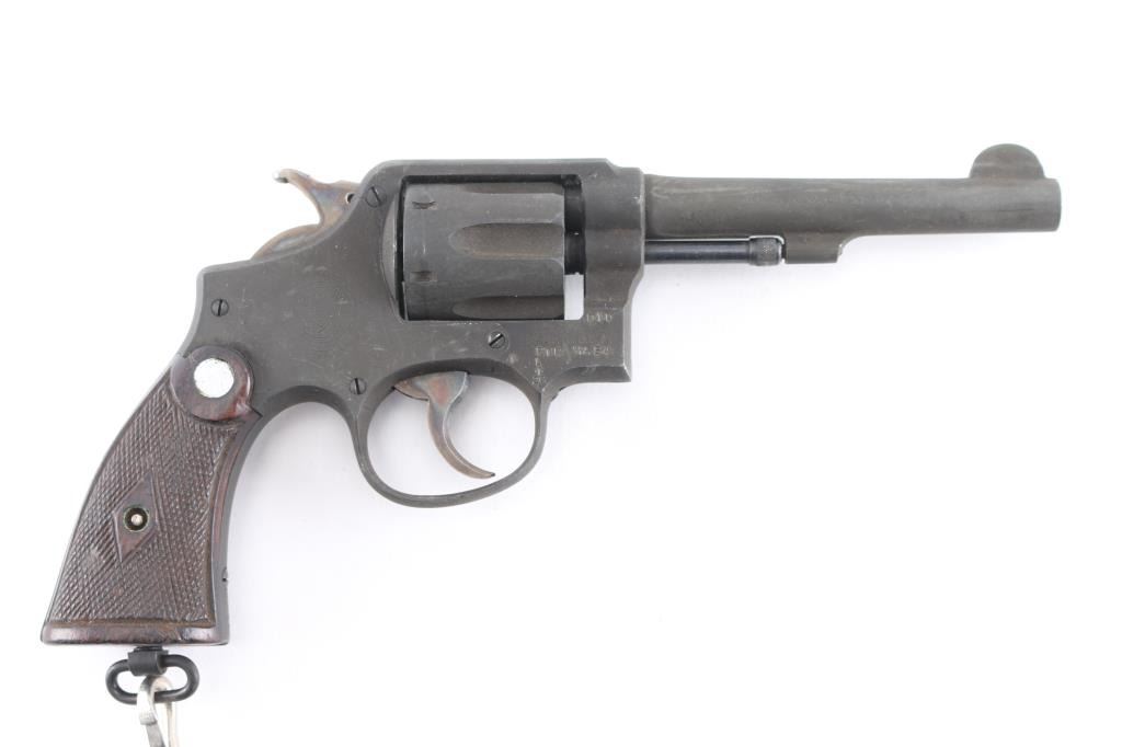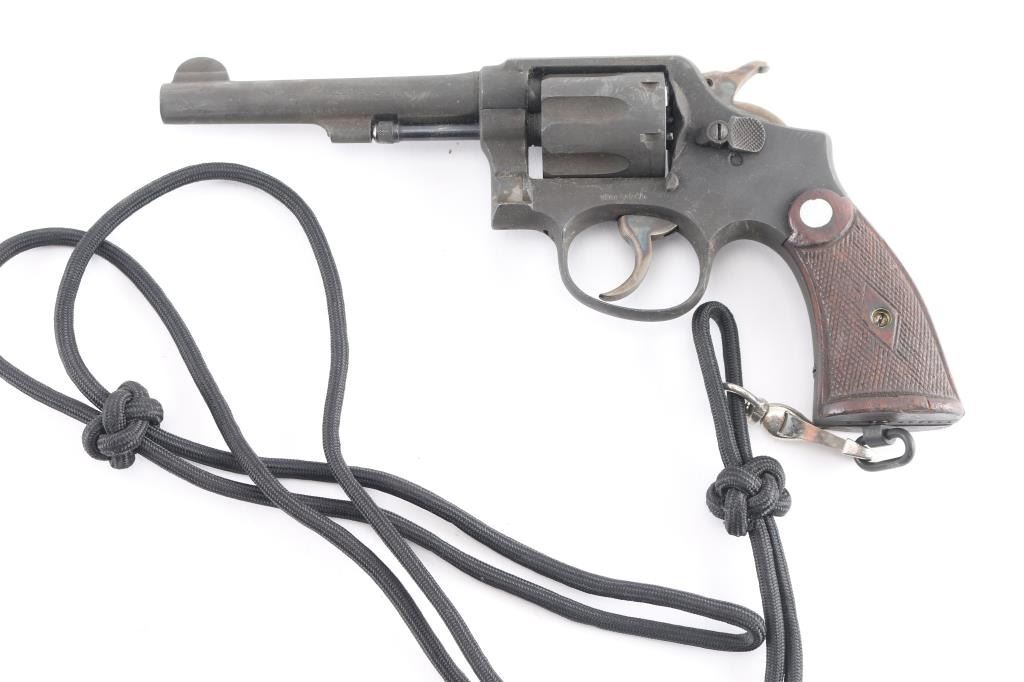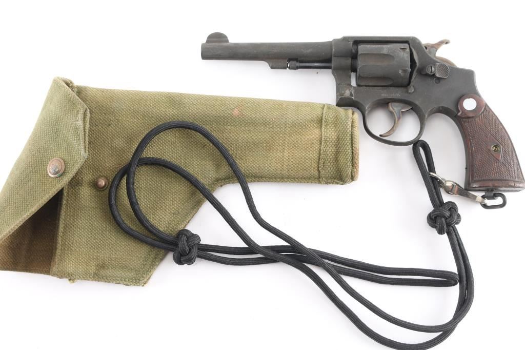 'Victory Model' Lend-Lease military revolver with Broad Arrow marks, refurbish date 1954. Features double action, 5" pinned barrel with half moon front sight, fixed notch rear sight, 6 shot fluted cylinder, checkered walnut S&W commercial style grips, lanyard ring at butt. Bore is very good. Thick brownish toned gray parkerizing covers 95% of metal, with handling marks. Grooved trigger and knurled spur hammer show good case colors. Wood grips are good or better. Action is smooth with tight lock-up. Includes greenish tan color cotton web full flap holster (UK military type with cleaning rod inside), lanyard.