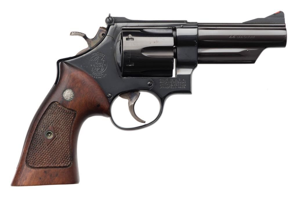*Smith & Wesson Model 29-2 DA revolver, .44 Magnum caliber, 4” barrel, S/N S284060, blued finish, target hammer and trigger, checkered wood combat medallion grips in overall fine condition showing little use or handling; fine bore, crisp action and markings; fine grips and approximately 99%+ original finish. Est.: $500-$1,000.