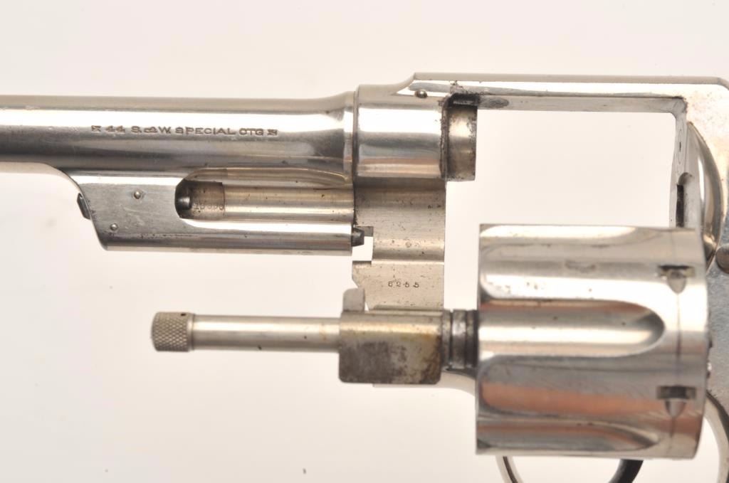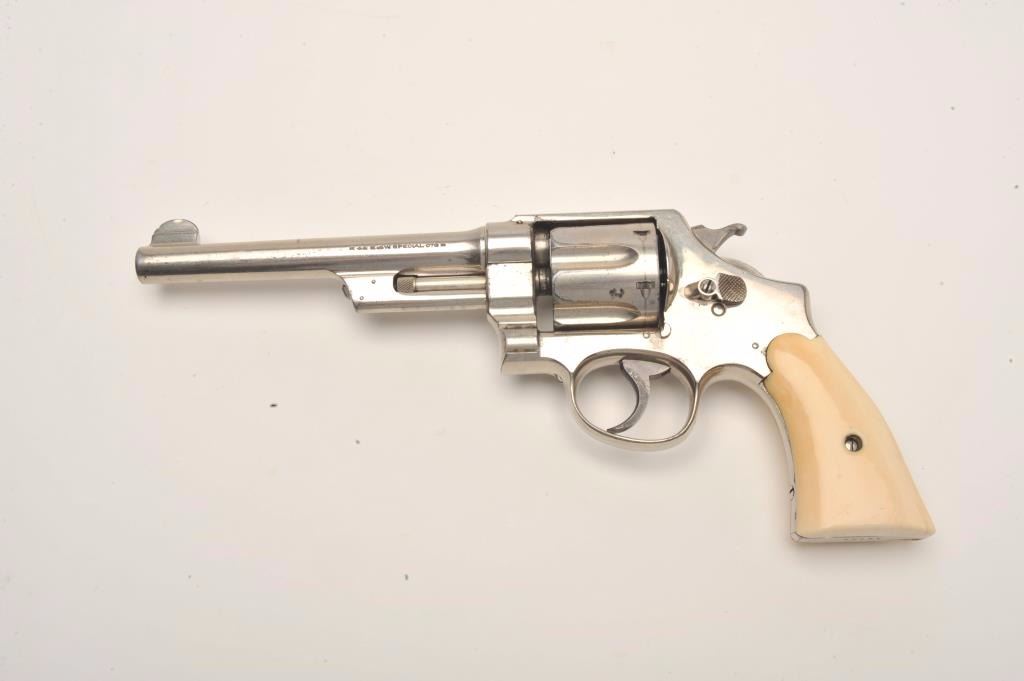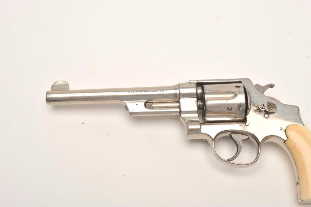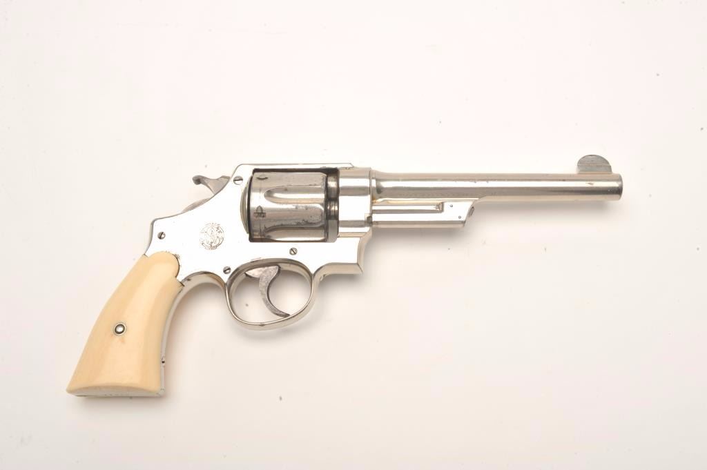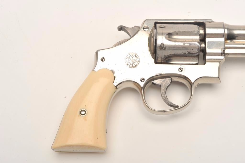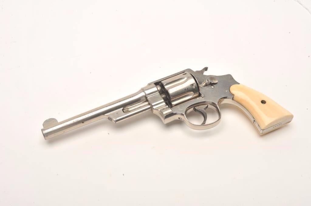 Smith and Wesson 1st Model Hand Ejector revolver, .44 S&W Special caliber, Serial #13880. The pistol is in fine overall condition with a 6 ½” barrel. The pistol retains approximately 90% of its factorynickel finish with wear noted at the muzzle and on the cylinder. The pistol features muted case coloring on the hammer and trigger. The smooth ivory grips are in very good condition with the color mellowing withage. The bore is very good, the action crisp and markings are sharp. The pistol includes a Smith and Wesson factory letter confirming all features other than the ivory grips, which were added later, indicating that thepistol was shipped to E.K. Tryon & Co., Philadelphia, PA., on January 18, 1917. This is a great factory nickel Triple Lock with beautiful grips. From the estate of Larry Gaertner. Est.: $1,500-$3,000. (C+R)