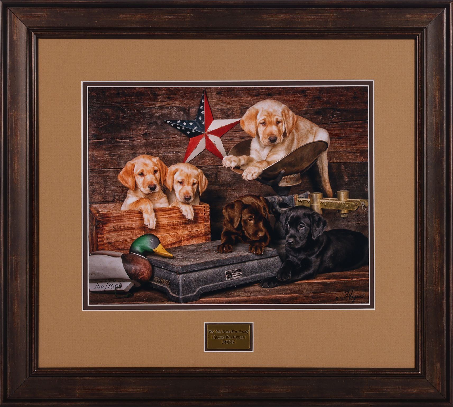 "So, You Been Here Long" by Dave Hagan captures the essence of Americana through a charming photographic composition. Hagan's artwork features yellow, chocolate, and black Labrador puppies arranged around a patriotic star, evoking a sense of warmth and nostalgia. This framed and matted 11” by 14” photograph is personally signed and numbered by Dave Hagan, highlighting the photographer's dedication to his craft and the authenticity of each piece. The artwork is further enhanced with a brass title plate inlaid in the mat, adding a touch of elegance and providing context to the patriotic theme. "So, You Been Here Long" celebrates the enduring appeal of Labrador retrievers and embodies the spirit of American tradition, making it a cherished addition to any art collection or Labrador enthusiast's home.