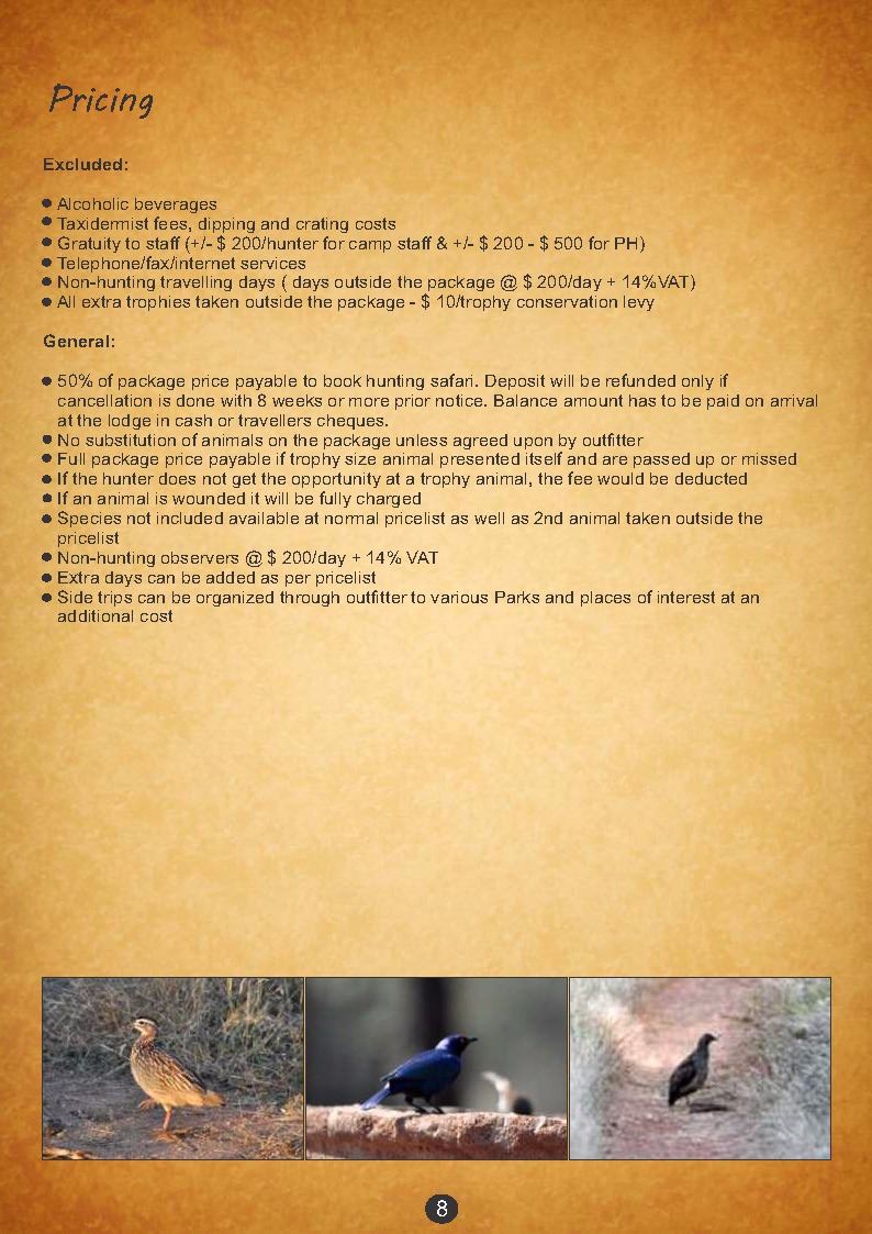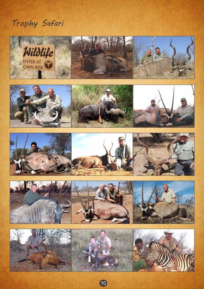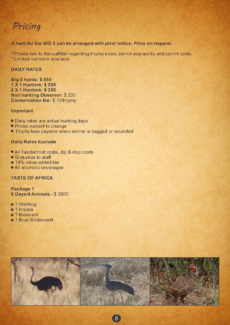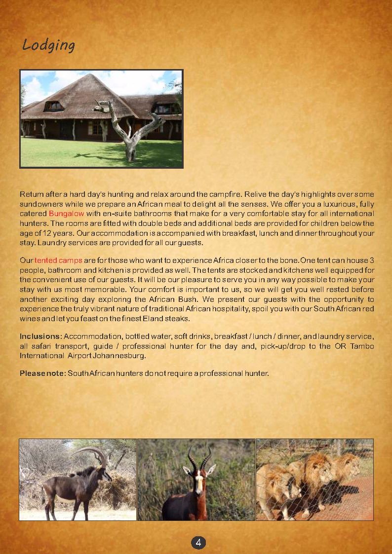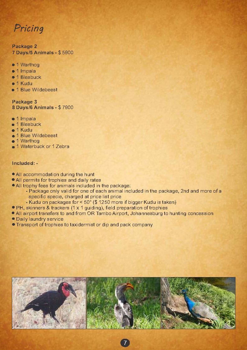 6 day hunt and we will look after your lucky winner entirely from the time he lands at O R Tambo international airport in Johannesburg to the time we drop him off after the 6 day hunt. It includes all board and lodging ,travell to and from the concession and all hunting including the Trophy Fees.