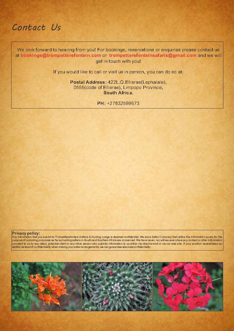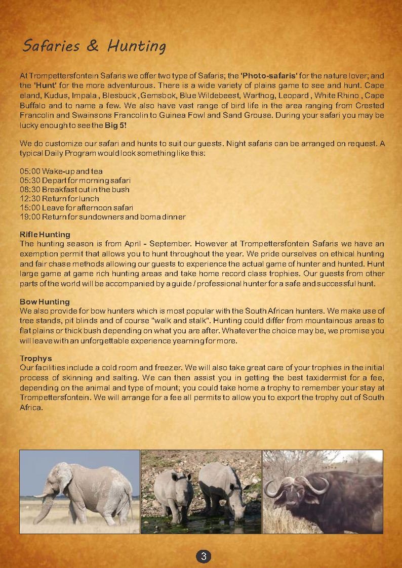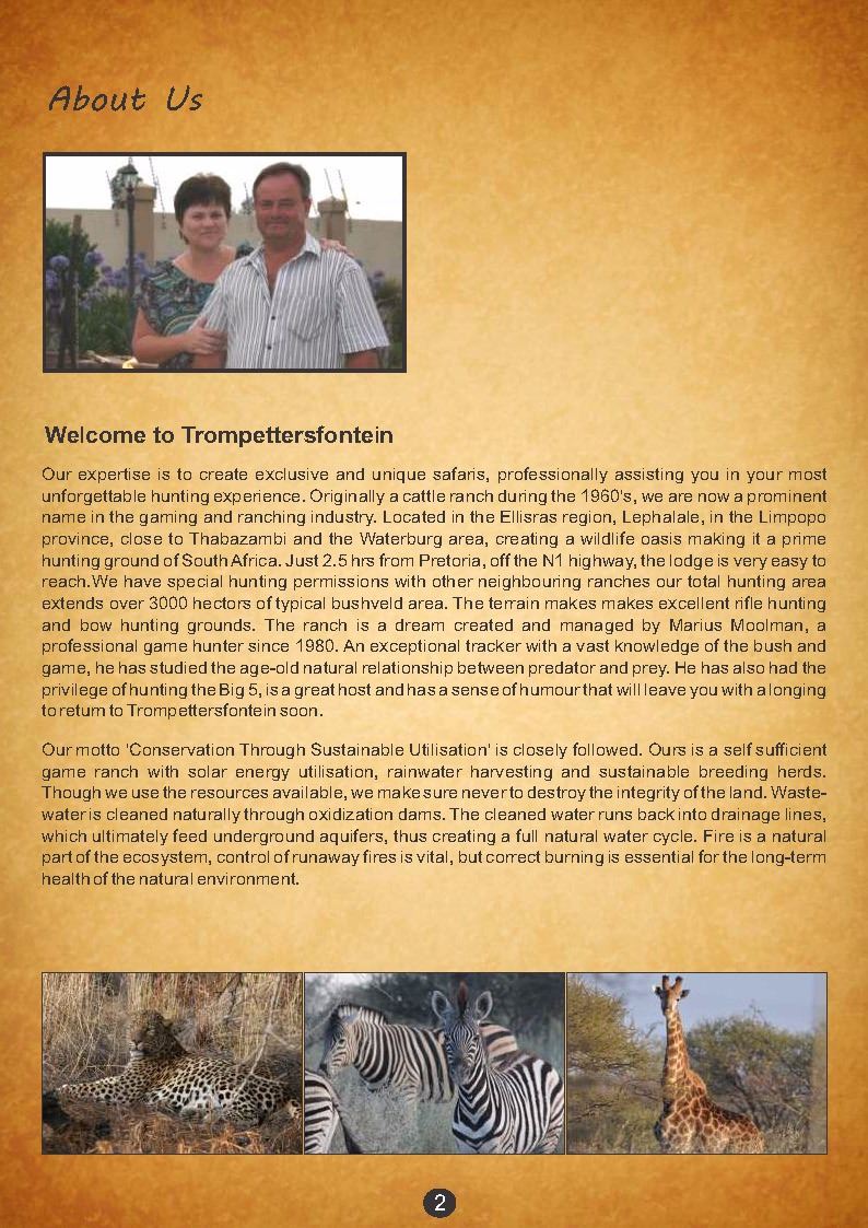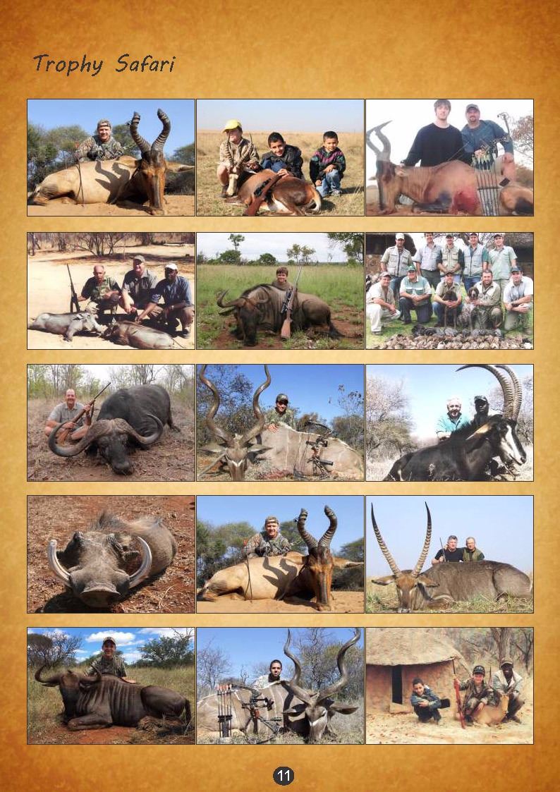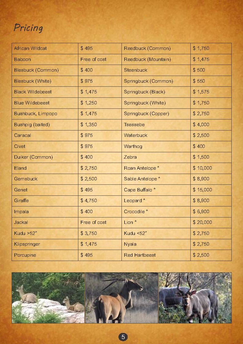 This hunt includes 4 trophy animals namely one of each Impala,Blesbuck,Warthog and Blue Wildabeest whose trophy fees are included in the donation. You can add other animals and hunt them as per our list price. You can add days or hunters also as per the price list. for details on this please do refer our website www.trompettersfontein.com