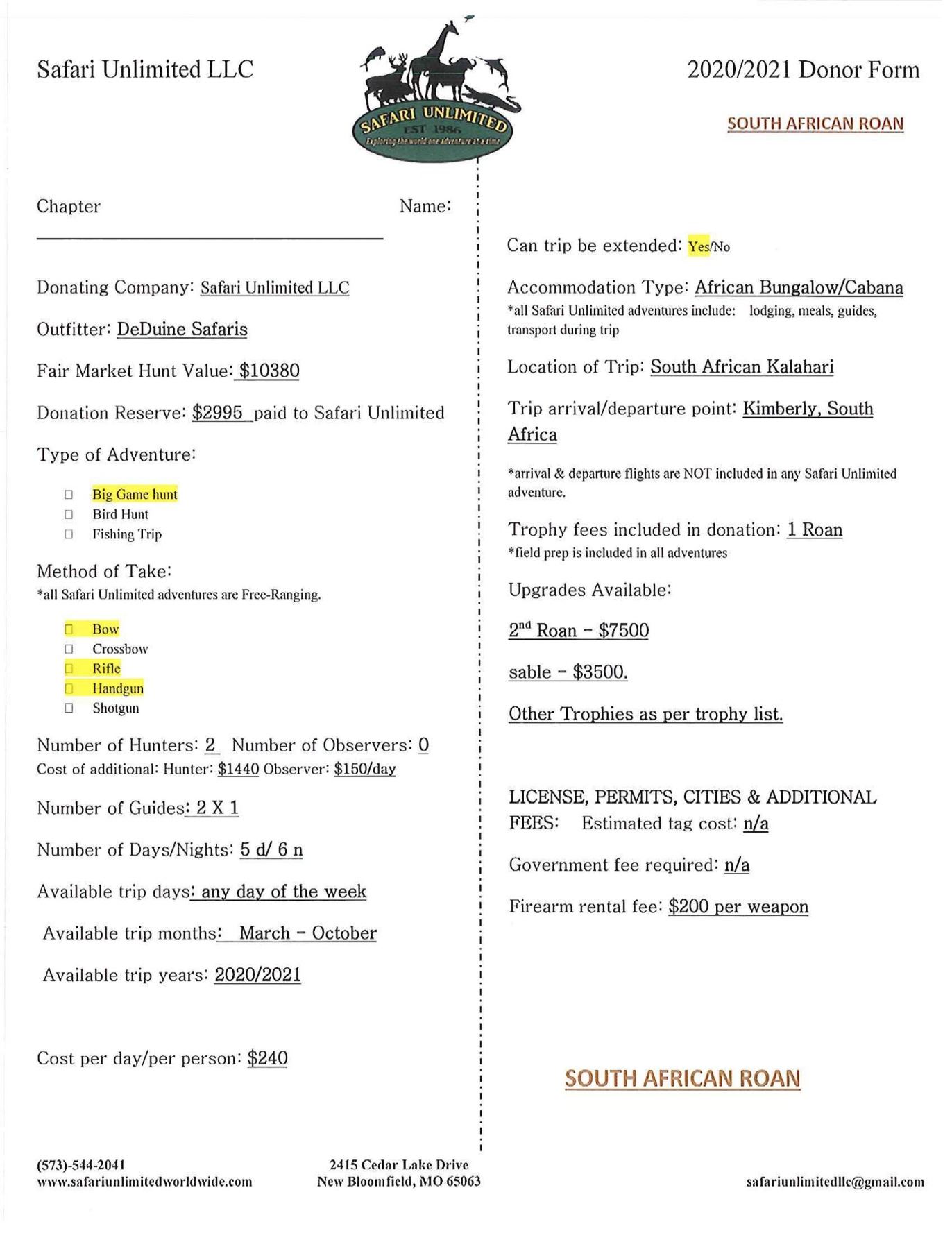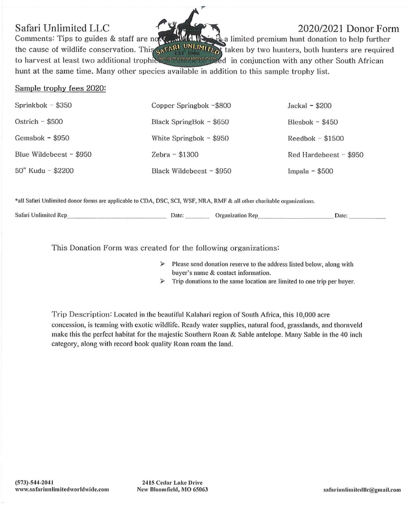 DeDuine Safaris has donated a 5 day/6 night safari for Roan and other plains game. Trophy fee is included for 1 Roan. Value $10,380. Click on image for additional information.