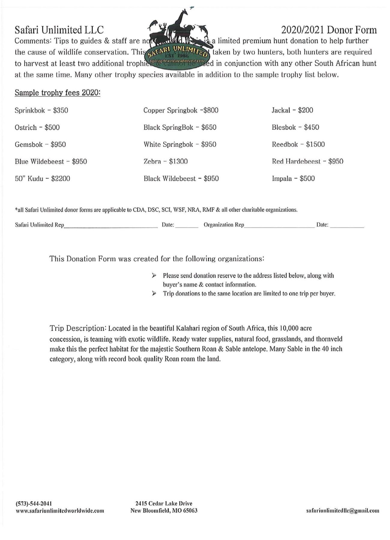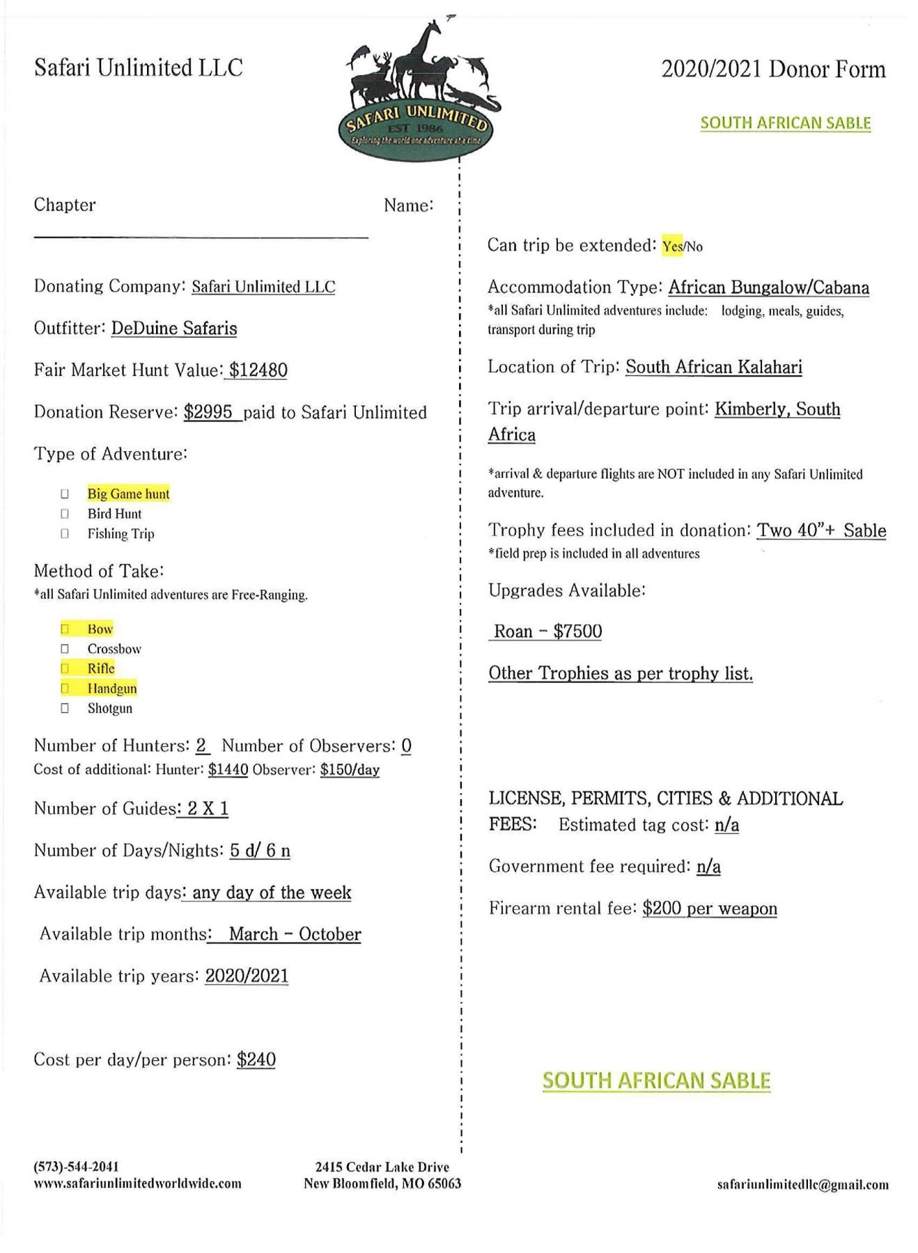 DeDuine Safaris has donated a 5 day/6 night safari for Sable and other plans game. Trophy fees are included for two 40"+ Sables. Value $12,480. Click on image for additional information.
